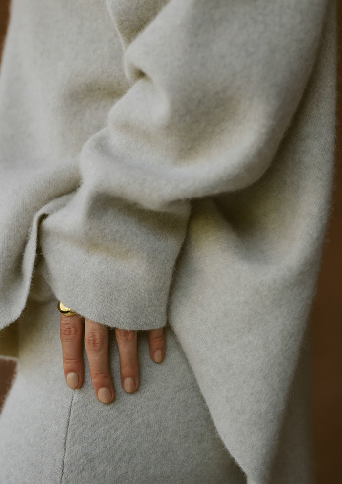 「シックになりがちなワントーンのスタイリングにも、リネーレリバーのふわっとした質感が奥行きを与え、クラスアップしてくれます。レイヤードのスタイリングや、アウターとの素材感の違いもぜひ楽しんで」。