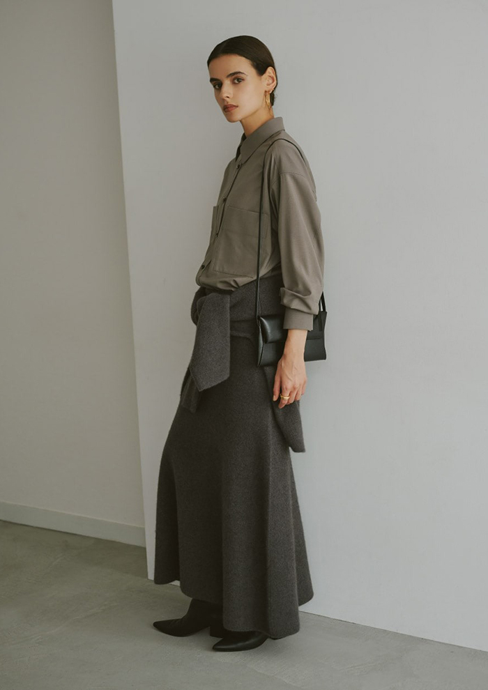 「やわらかな表情ながら立体感のある構築的パターンが魅力のレニーリバーシリーズ。トップスはリラックスしたオーバーサイズシルエットをベースに、肩の切り替えでモードな印象に仕上げています。ほどよい深さのVネックと長めの袖丈が、女性らしいニュアンスをプラス。スカートは、すっきりとした腰まわりから裾にかけてフレアになるフェミニンなシルエット。ニット素材でこのバランスができるのは、ハリ感と弾力性のある編み地ならでは」。