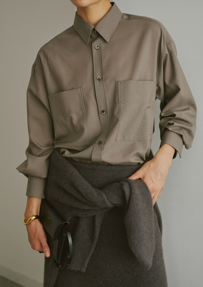 「Super120Sの3/72という細番手を3本撚りあわせた糸を使用したシエラウールシリーズ。素材の良さを引き出すため、最小限の加工に留めています。糸ムラが少なく、柔らかい風合いでありながらハリのある素材感が特徴。生地の厚みがちょうどよく、アウターに響きにくいためレイヤードスタイルにもおすすめです」。