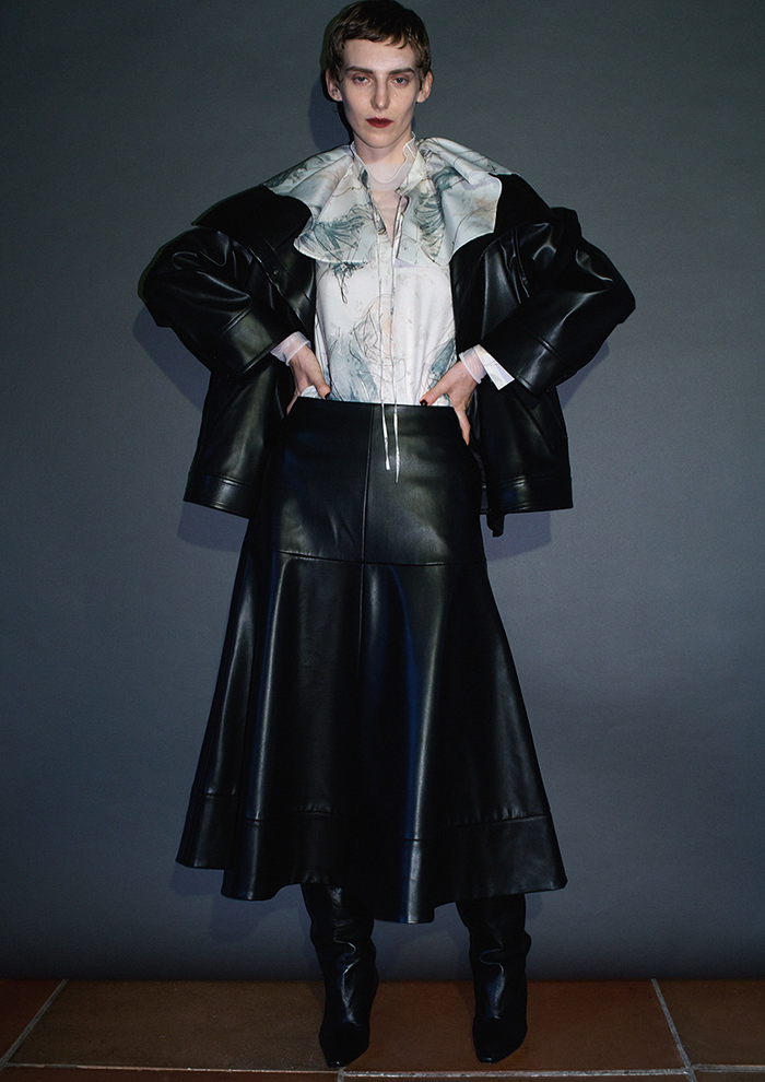 「本物のレザーのような質感が楽しめる、上質なフェイクレザーのブルゾン。大きめのスタンドカラーを開いたようなデザインが、適度な抜け感を演出し、女性らしい印象をプラスします。同シリーズのスカートを合わせるとよりモダンに。インナーにはオリジナルのアートプリントブラウスで、華やかさを演出するのがおすすめ」。