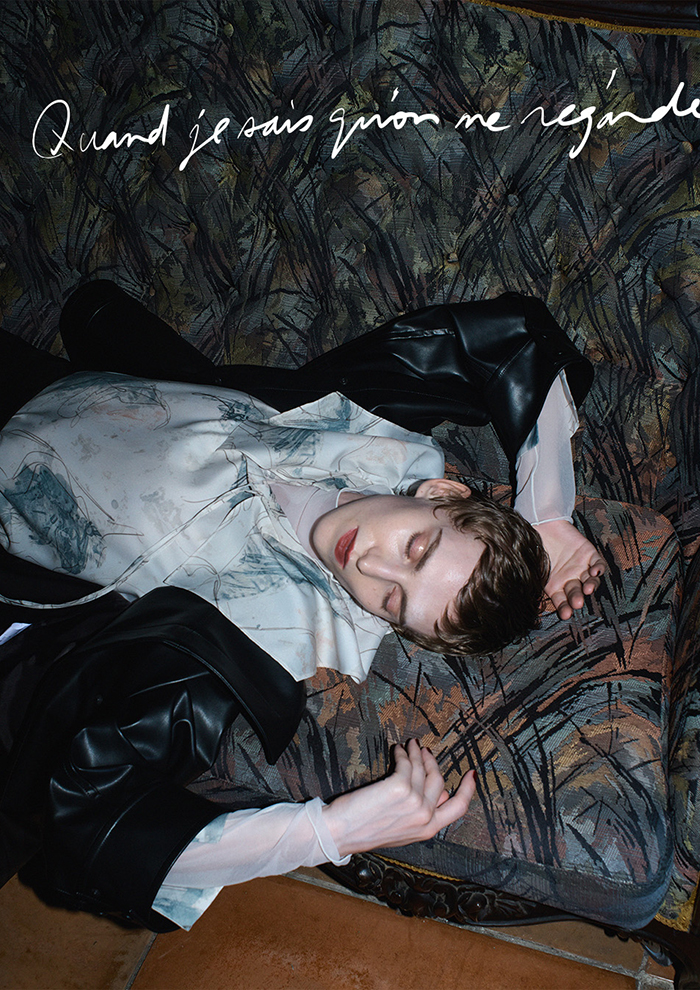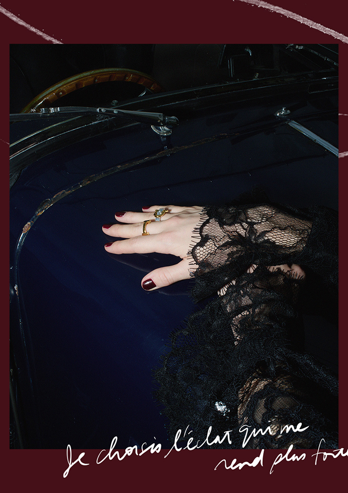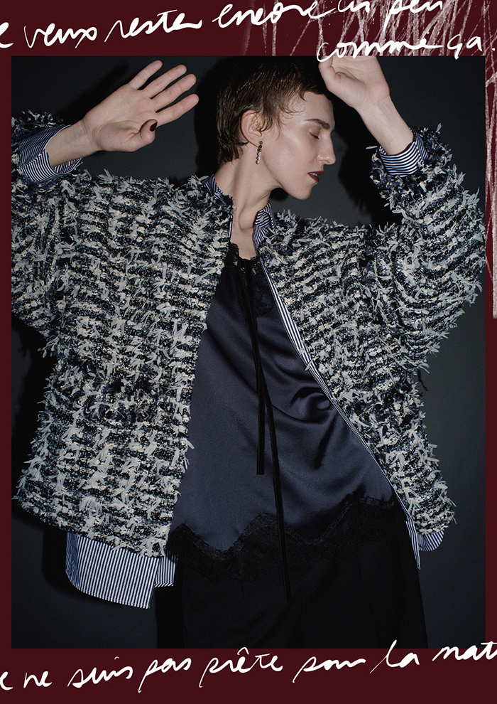 「スタイリングを一気に旬顔に、そして華やかな雰囲気を添えてくれる“レースサテンキャミソール”。上品な光沢を放つサテン生地に、フランス老舗メーカーの繊細なリバーレースを組み合わせた逸品です。メインとしてはもちろん、インナーやレイヤードにと、スタイリングは自在。ツイードコートとベロアリボン付きのシャツをレイヤードして、モードかつレディライクに着こなして」。