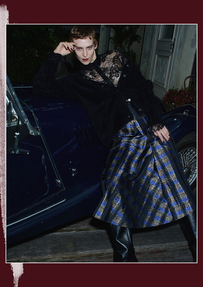 「ぜいたくなフォックスカシミヤで仕立て、軽やかさと暖かさを両立したニットカーディガン。今年はフォックスの混率を高め、さらにリッチな毛吹きと光沢感、そしてしなやかな肌触りを実現しました。深すぎず、デコルテを美しく見せるすっきりとしたネックラインが、大人の女性に着こなしやすいポイント。ラメ糸でていねいに織ったチェックスカートは、アシンメトリーなデザインが唯一無二の存在感を放ちます。レザーやフーディーなどを合わせて、カジュアルにも着まわしていただきたい一枚」。