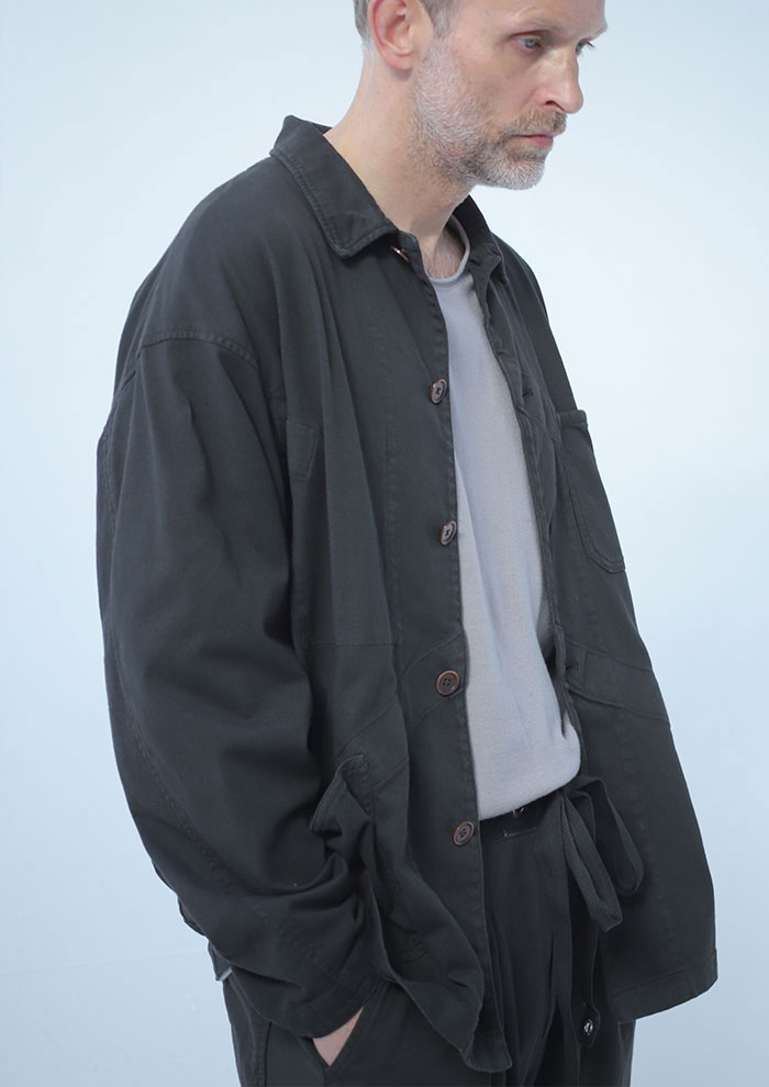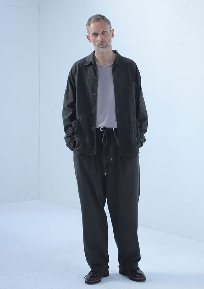 「フレンチビンテージのカバーオールと古いスウェットパンツを、度詰め天竺で再構築したセットアップ。ジャケット“FRENCHORE”は補強テープのアタリや直染めによる自然な色落ちが魅力で、ラフさのなかにモダンな落ち感を漂わせます。パンツ“ROYALEASY”は、ミリタリーディテールを効かせつつ、断ち切りの裾とワイドシルエットで軽快に。粗野さと洗練が交差し、大人のリラックススタイルを新鮮に引き上げてくれます」。