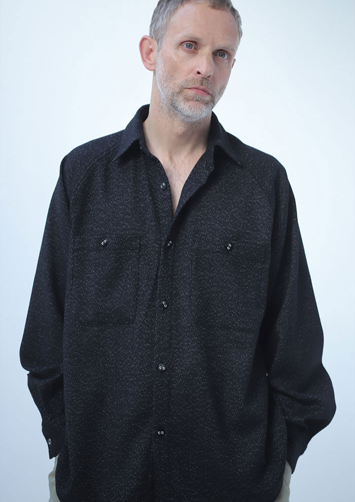 「尾州の光沢感が美しいゴマシオウールで仕立てた、特別なオーバーシャツ。ゆったりと着こなせるラグランスリーブのシルエットに、ミリタリーとスポーツの要素をさりげなく取り入れました。軽やかな羽織としても活躍する一枚です。ベーシックでありながら、どこか新鮮。日常をちょっと特別にしてくれるシャツです」。