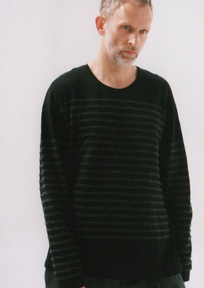 「ウールとコットンを巧みに組み合わせた漆黒のバスクボーダーのカットソー。異なる素材が生む質感の差が、一色の中にも豊かな奥行きを演出。ウールの上質な風合いとコットンの心地よさが、大人にふさわしい深みのある表情をつくり出します。クルーでもVでもない、こだわり抜いたネックライン。トップスを重ねたときの美しい胸元の見え方まで計算した、絶妙なバランスです」。