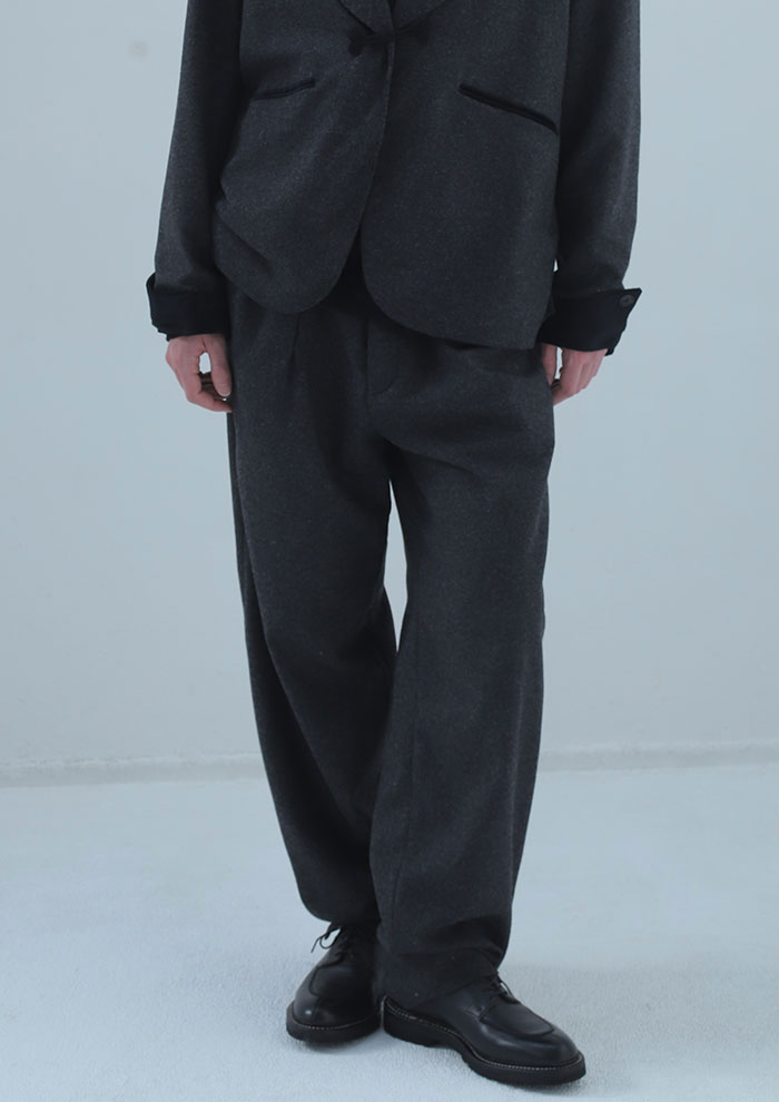 「プライベートでも愛用している1940年代フランスのビンテージトラウザーをベースに、オリジナルの雰囲気を残しつつ、現代的なディテールにアップデート。サイドに入れたギャザーが生む自然な丸みと、ゆとりのある腰まわりがリラックス感を演出します。オリジナルよりも丸みを強調したシルエットにし、丈は長めに設定。裾をたっぷりたゆませて、クッションのようにふわりとはくのがおすすめです。バックポケットや裾のスリットにもこだわり、尾州ウールにカシミヤをブレンドして上質な柔らかさと品の良さを両立。クラシックを今の空気でまとう、大人のための一本です」。