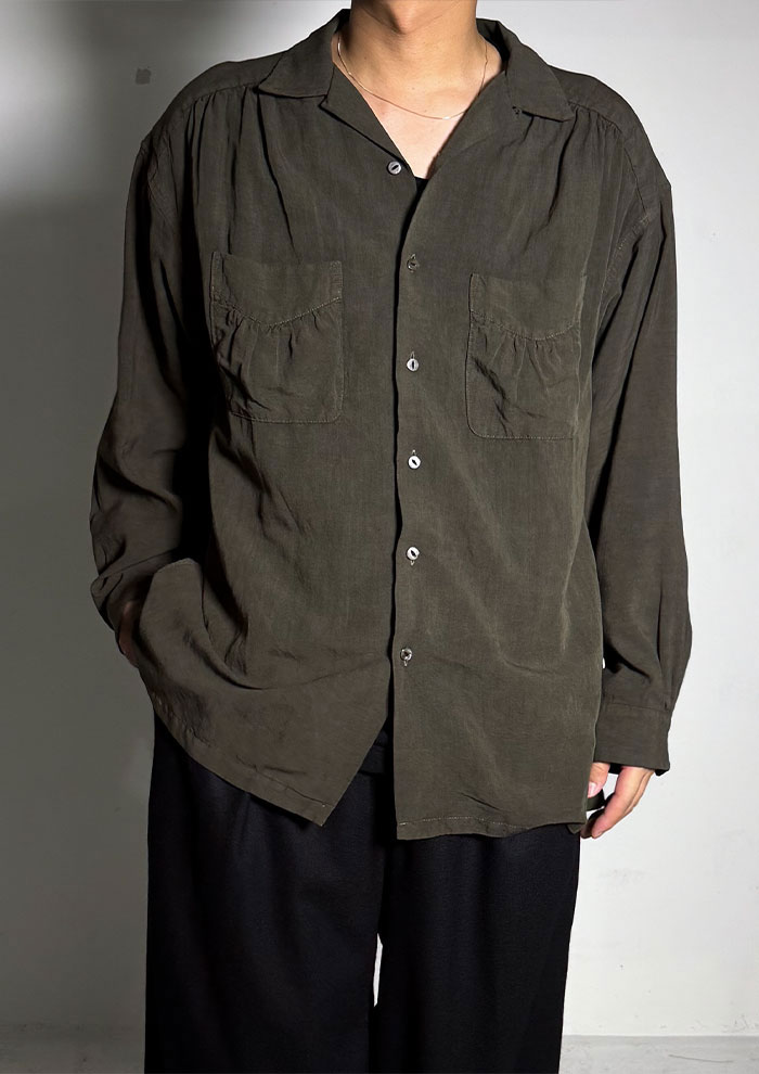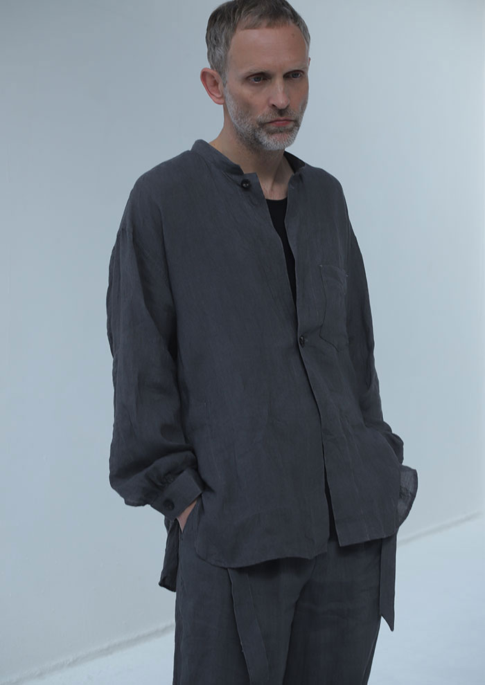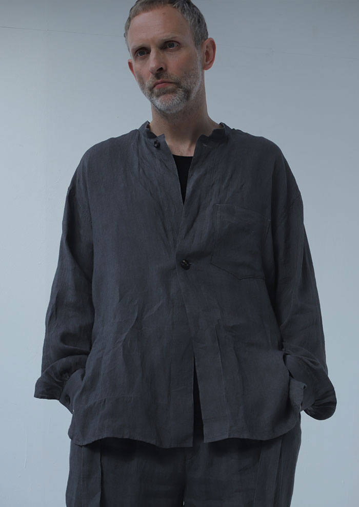 「毎シーズンなぜか欲しくなってしまうギャザーシャツ。今季は素材と染めで新しい表情に。レーヨンとリネンの生地に反応染めを施し、さらにピグメントとバイオ加工を重ねて奥行きのあるトーンに仕上げました。ヨークや袖口など、随所にふんだんに入れたギャザーが立体感を生み、動くたびに陰影を実現。本黒蝶貝ボタンが甘さを抑えた大人のムードを添えます。着るほどに味わいが深まる一枚」。