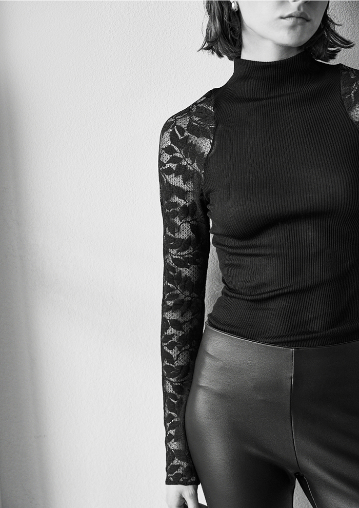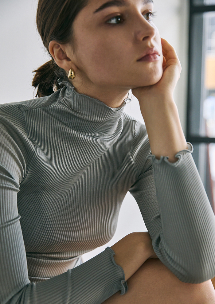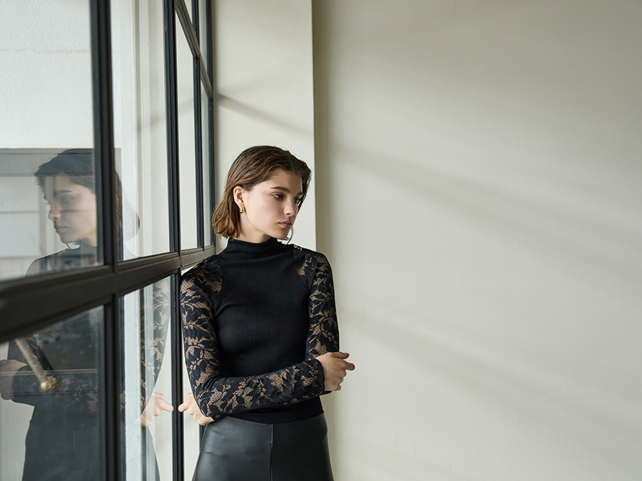 「まずは、大注目のレースロングスリーブから。腕全体にレースをあしらった1枚でサマになるアイテム。甘さを抑えたリーフ柄のレースは、フランスの老舗「ソフィ アレット」のリバーレースです。身生地にはコットン100%のリブを使用し、軽やかで快適な着心地。アメリカンスリーブの切り替えとハイネックがシャープな印象を引き立てます。秋口は一枚で、冬はレイヤードで、レースを見せるスタイリングを楽しんで」。