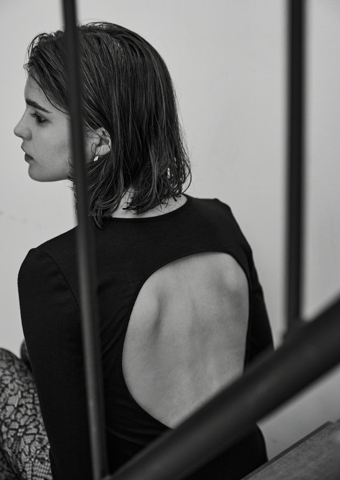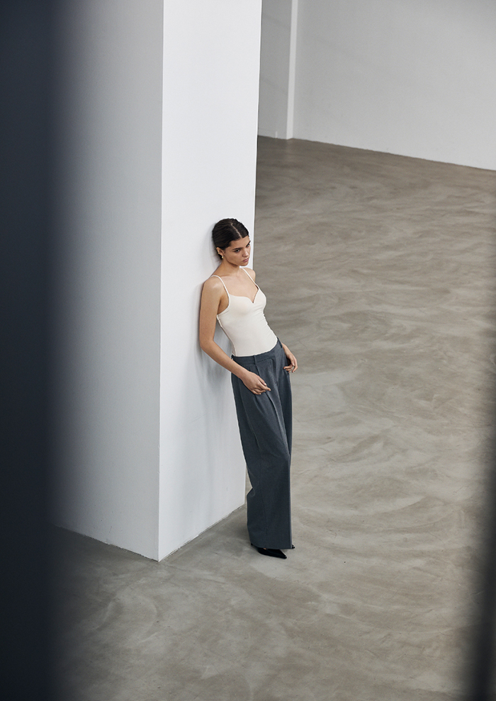 「大きく開いたバックスタイルがモードな印象のボディスーツ。極細糸で編み立てたウール100%の身生地は驚くほどやわらかく、ちくちくしない肌触りです。取り外し可能なパッド付きのため1枚で着用でき、マチ部分はスナップボタンで着脱もスムーズ。優しい素材感と大胆なデザインのコントラストが魅力のほかにはない一着」。