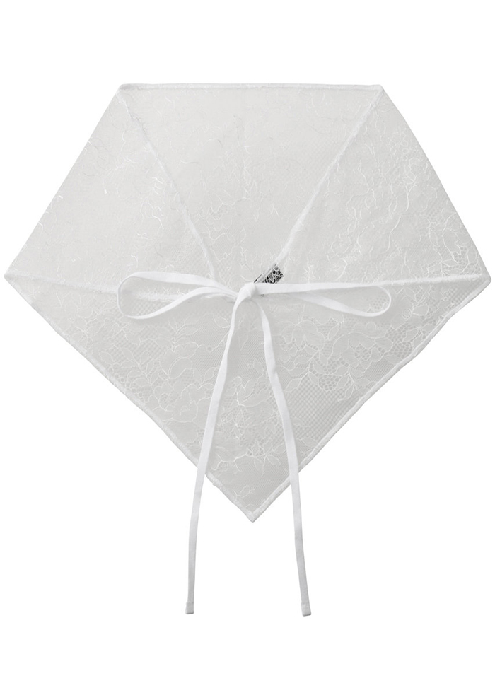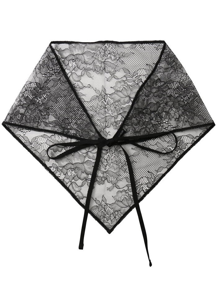 「こちらは、「アロマティック」らしい上品な花柄リバーレースを用いたトライアングルスカーフ。光沢のあるフィロスコッチア綿糸100%のストラップで肌あたりもやわらかく、高級感が感じられます。首元やヘア、腰に巻くだけで装いに華やかさを添え、自由なスタイリングが楽しめる、大人の女性にぴったりの一枚」。