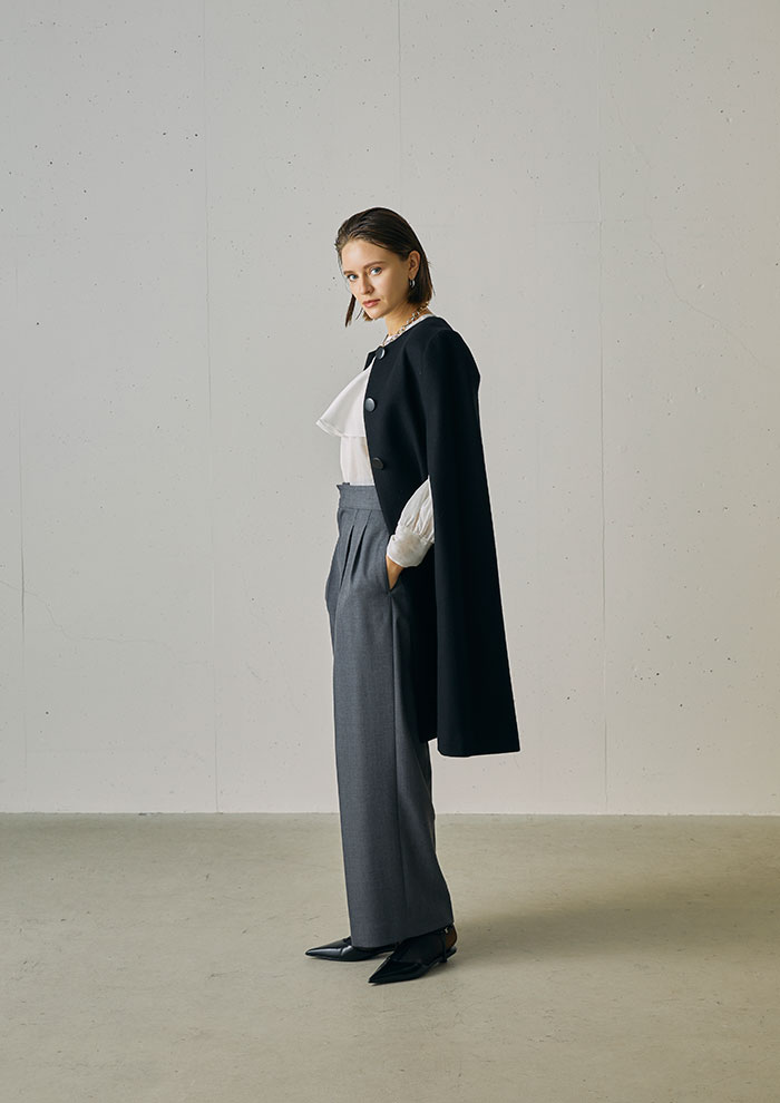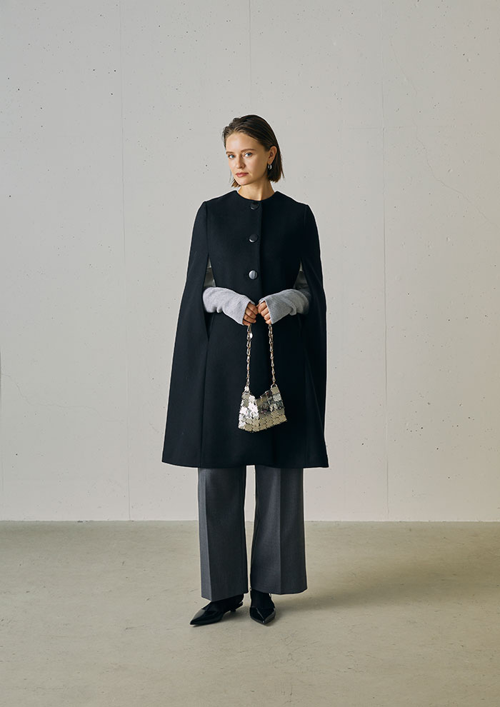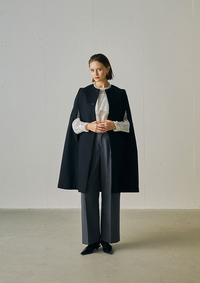 「ふわりと揺れるフォルムが印象的なマント&ケープ。柔らかなウールをぜいたくに使用し、構築的でありながら軽やかな着心地に。まとうだけで洗練と優雅さを両立できる、「ジェイドット」ならではのシルエット」。