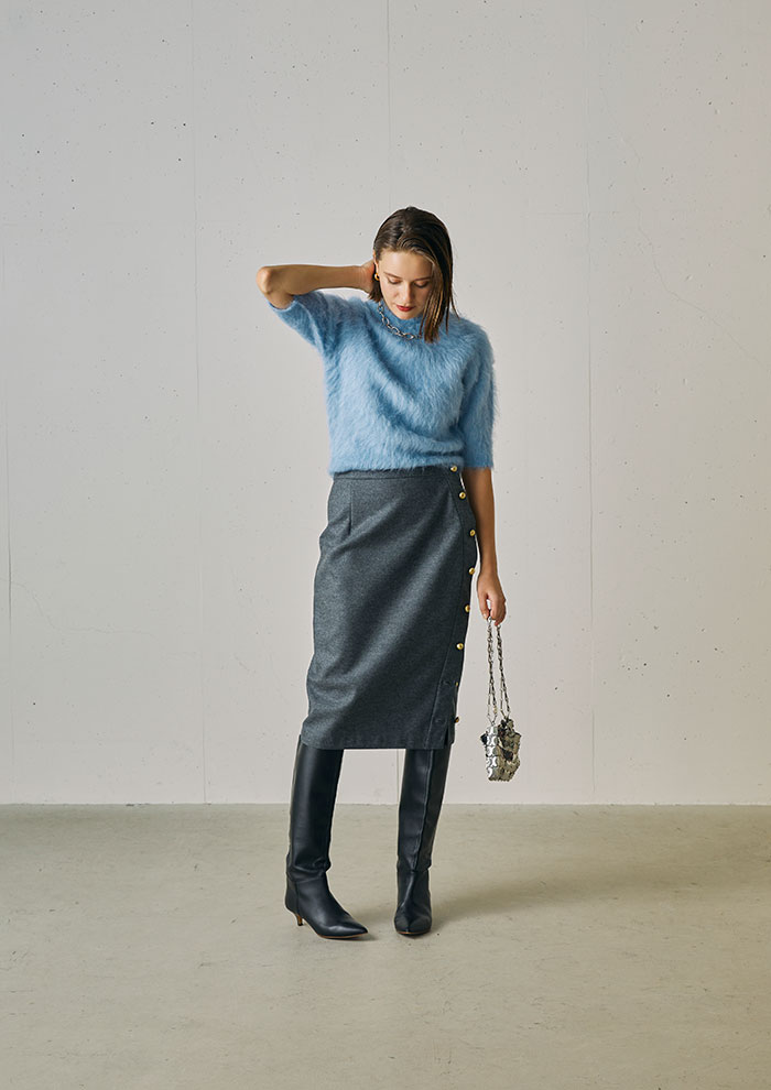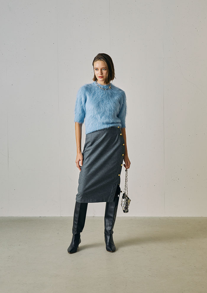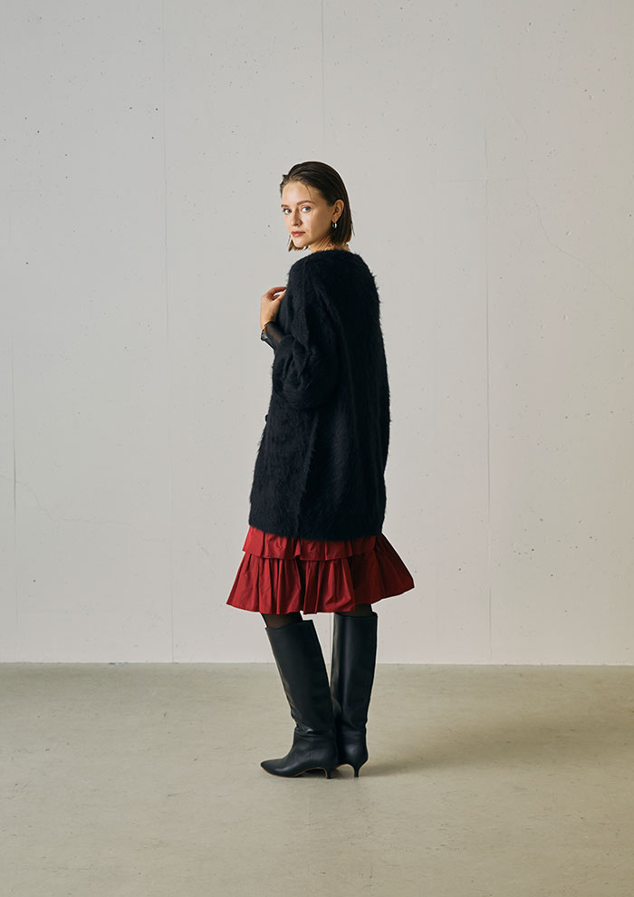 「上質なアルパカをブレンドしたニットは、思わず触れたくなる柔らかさと軽やかさが魅力。ボリュームのあるフォルムにクリーンな色合わせが、冬のスタイルにやさしい表情を添えます」。