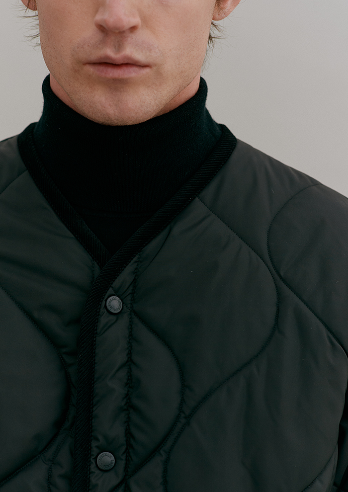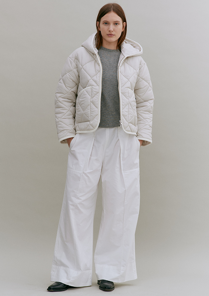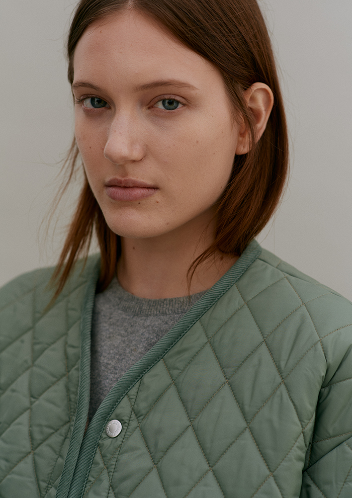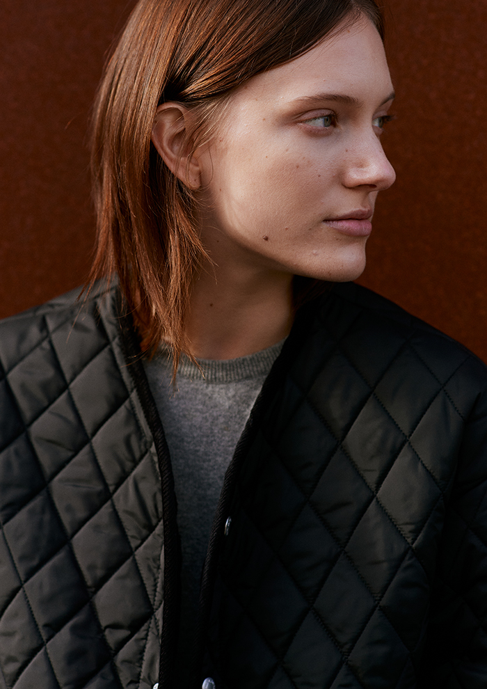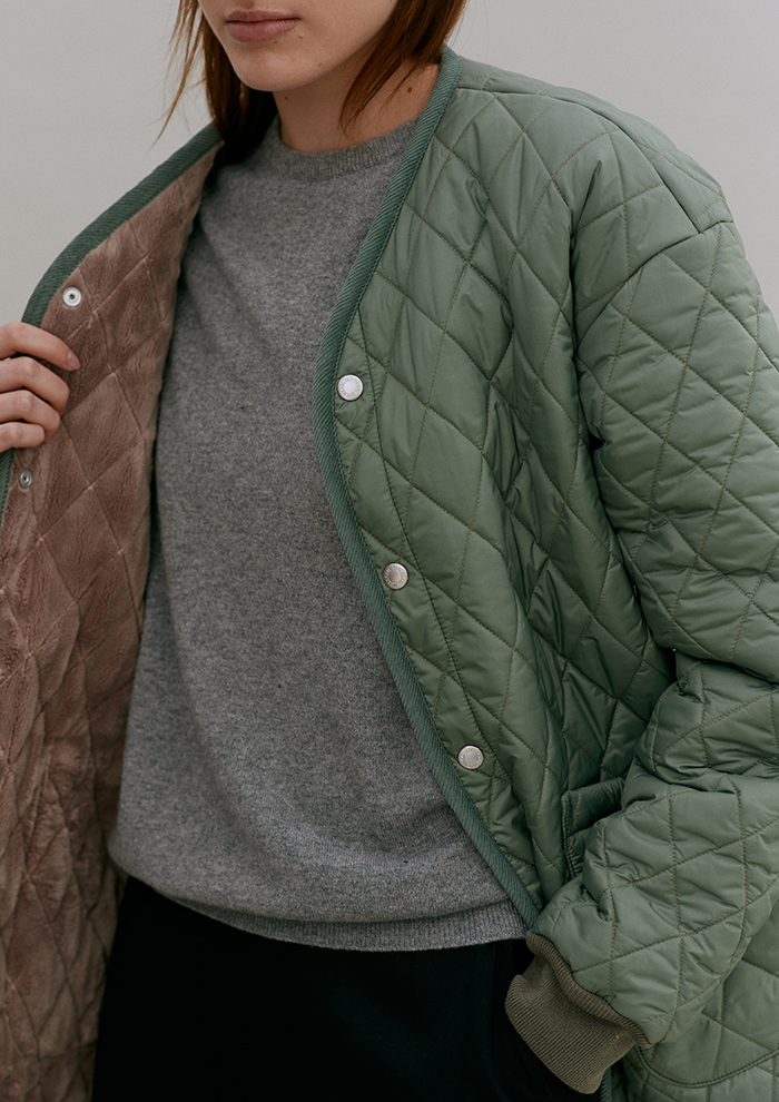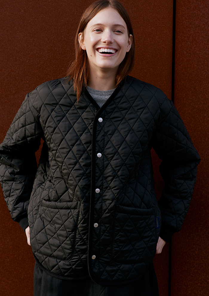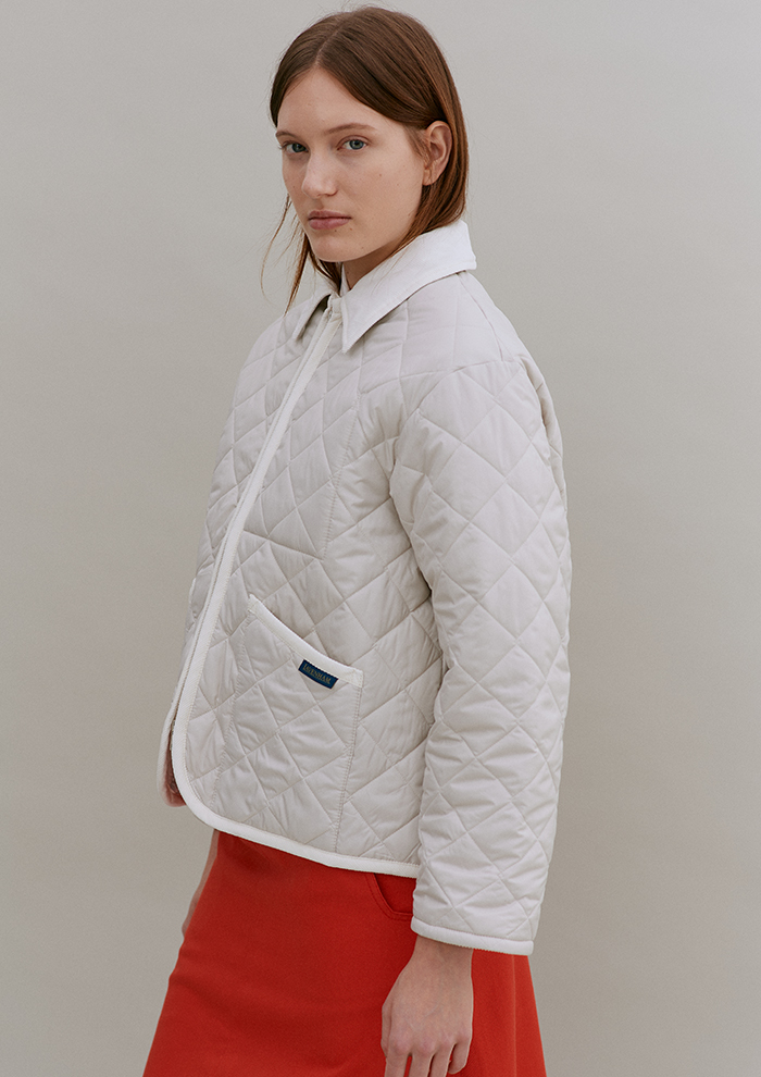 「定番シリーズの“クラシックス”に2024年から仲間入りした“テイナム”は、同コレクションを象徴する2インチのダイヤモンドキルティングやオーガニックコットンの襟といったディテールを踏襲しながら、クロップド丈のボクシーなシルエットに仕上げた一着。短めの丈とゆとりのあるアーム設計が、秋冬のレイヤードスタイルに映えます。クラシックな美しさにモダンなバランスを加えた、今季注目のアイテム」。