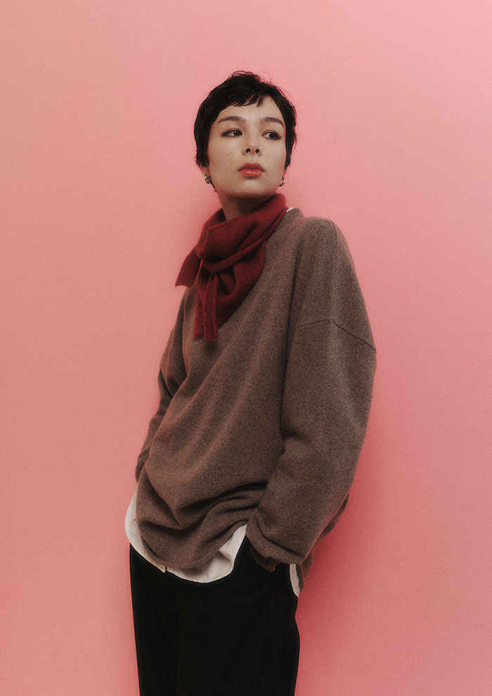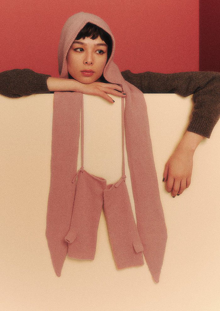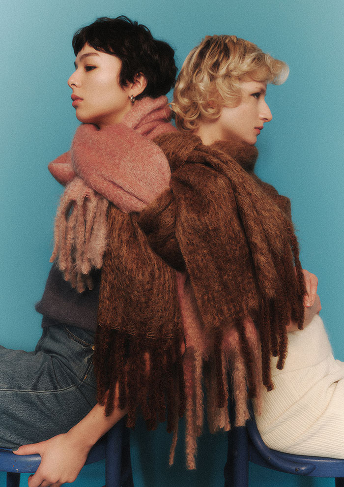 「ウールとフォックスの混紡糸を使用したなめらかな肌触りのトライングルスカーフ。毛足の長いふわふわとした見た目は、冬のスタイリングに暖かみも添えてくれます。バブーシュカとしてトレンド感を演出したり、さっと首にバンダナ風に巻いたりと、アレンジしやすいサイズ感もポイント」。