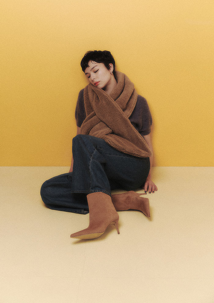 「ふわふわの手触りが魅力のエコファーのストール。エレガントな印象になりがちなアイテムですが、形をトライアングルにすることでカジュアルな装いにも合わせやすく、幅広いシーンでお使いいただけます。スナップボタンで着脱も簡単! 気軽に取り入れられる、今季いち押しのアイテムです」。