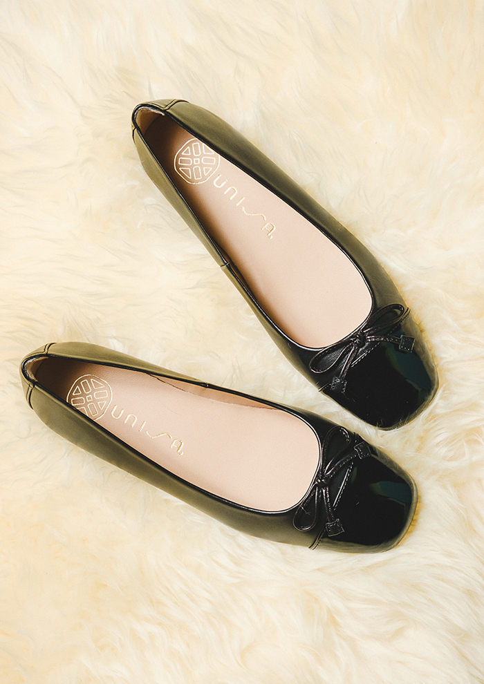 「丸みを抑えたスクエアトウに、艶やかなパテントのトウキャップが好相性。さりげないリボンディテールがクラシカルな気分を引き立てます。足入れの柔らかさや軽量ソールによる歩きやすさも魅力で、オン・オフ問わず活躍。華美になりすぎず、シンプルなのに洒落て見える。その絶妙なバランスが、日常のおしゃれを引き上げてくれます」。