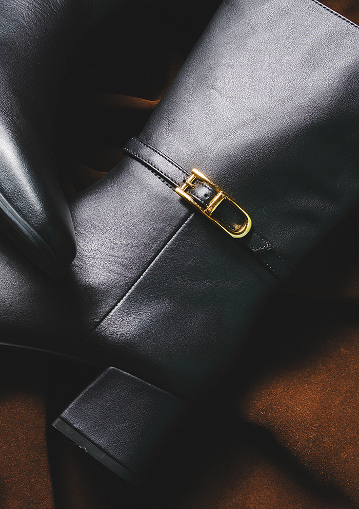 「ソフトなレザーを使用した、足に優しくなじむミドルブーツ。ほんのり丸みを帯びたスクエアトウと、くしゅっと自然に沿う筒のフォルムが特徴です。ミニマルなシルエットに、ゴールドのバックルベルトが華やぎとほどよいエッジをプラス。安定感のあるチャンキーヒールも、歩きやすさと美しさを両立します。快適なフィット感は、毎日でも履きたくなるはず」。