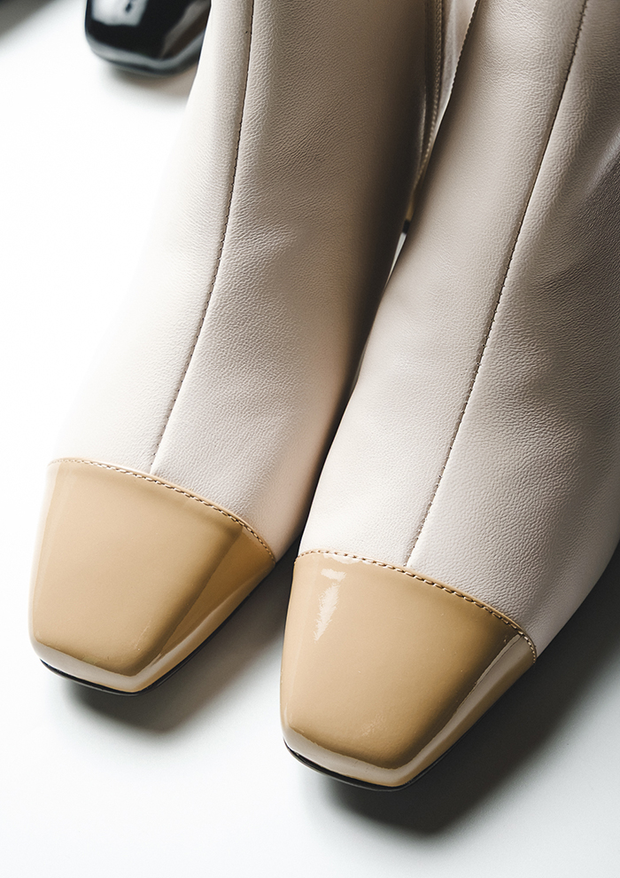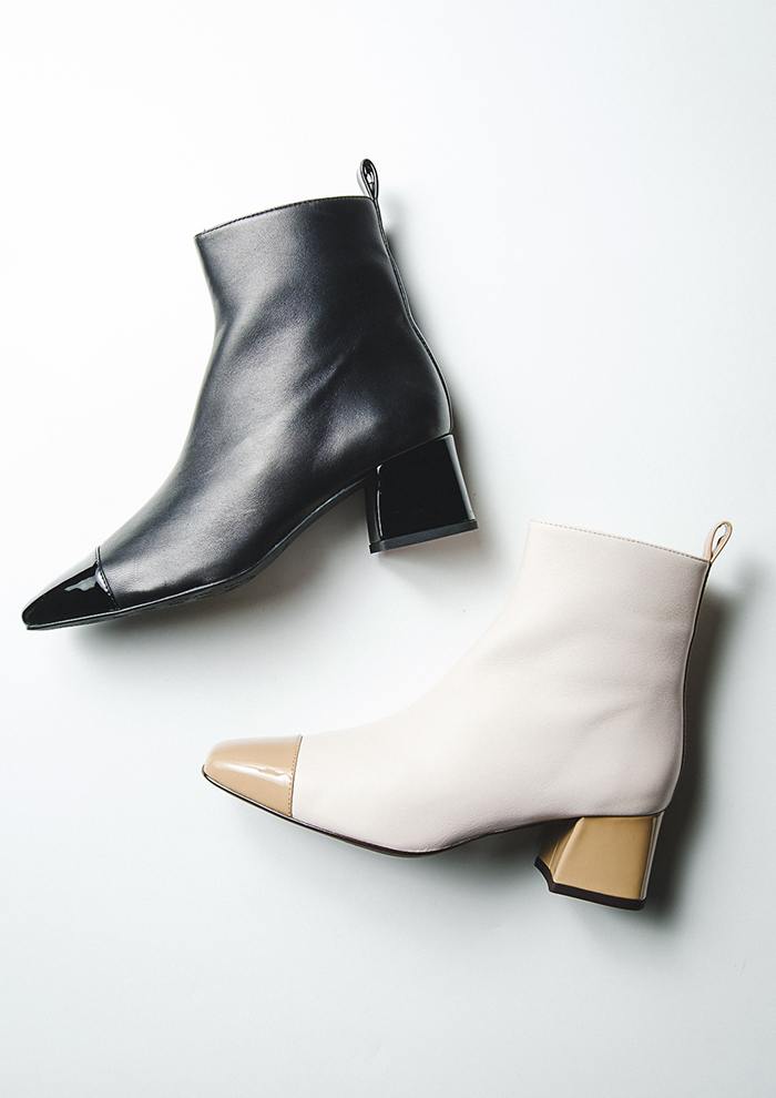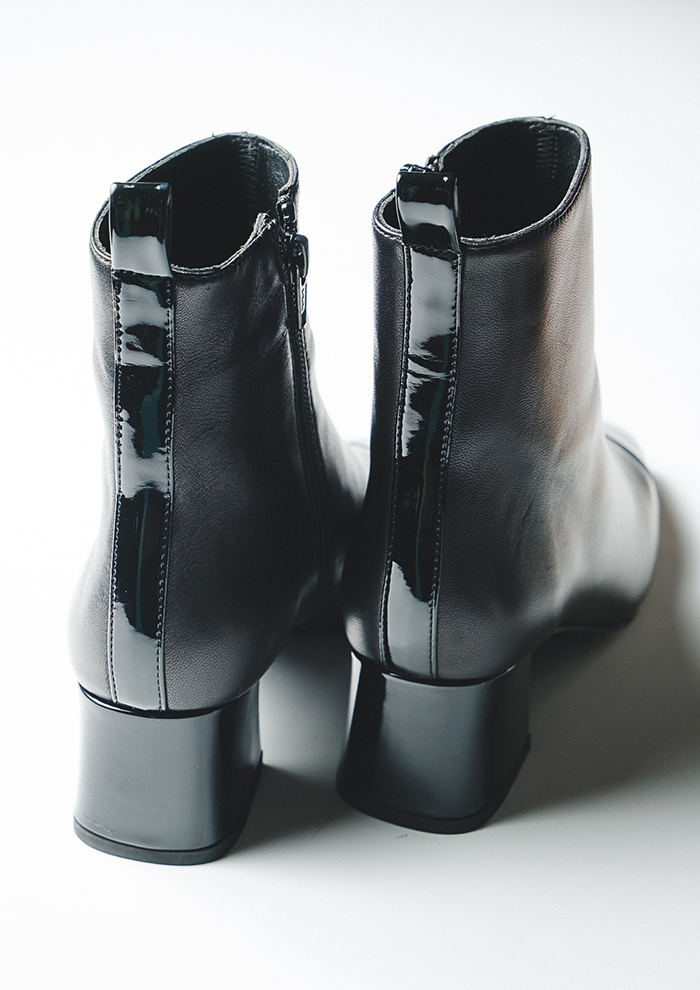 「ミニマルな佇まいに、異素材の光沢が映えるショートブーツ。艶やかなエナメルをトウとヒールに切り替え、シャープなアクセントに。やや長めのスクエアトウと、安定感のあるチャンキーヒールで、都会的な洗練と歩きやすさを兼ね備えました。上質感のあるマットなレザーとのコントラストが、大人の余裕を感じさせて。端正ながらどこかモードな、秋冬の装いに映える一足です」。