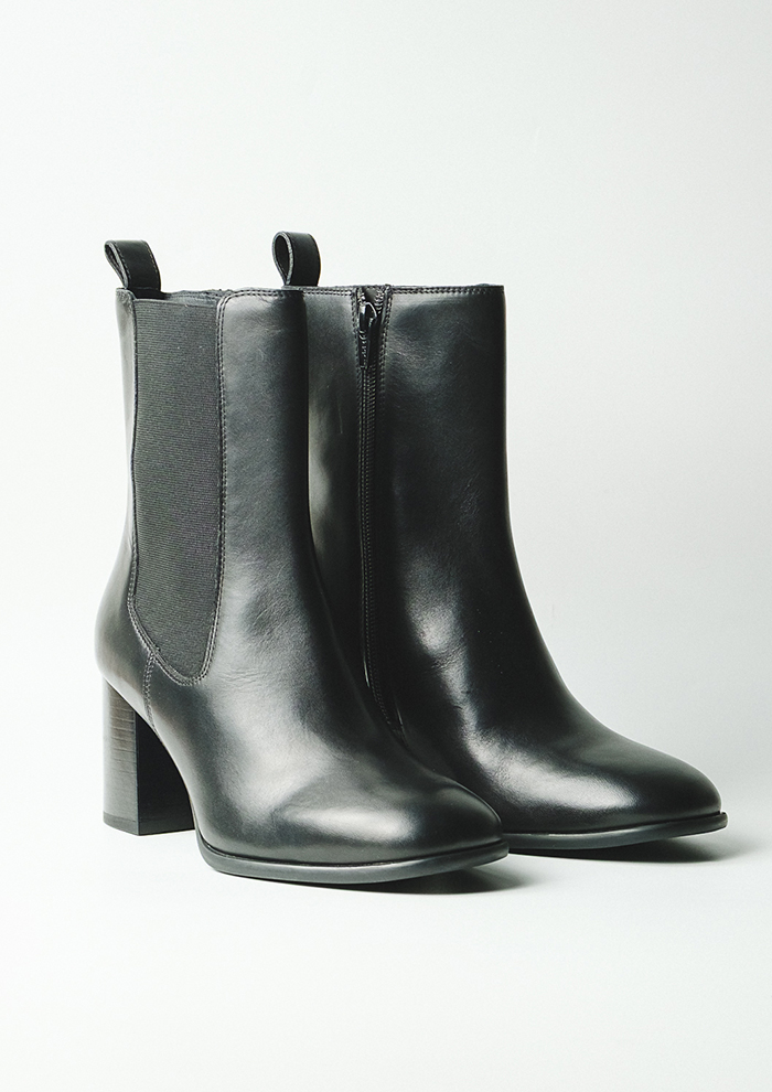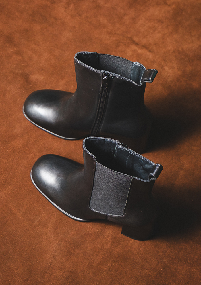 「美しく磨き上げたスムースレザーと、サイドの幅広ゴアが目を引くサイドゴアブーツ。スマートなシルエットに対し、チャンキーヒールでバランスをとった絶妙なデザインです。すっと足を通せるイージーな履き心地ながら、足首まわりにフィットしやすい構造で安定感も◎。すっきりとした見た目のサイドジップ仕様は、360度どこから見ても絵になる佇まいです。凛とした表情と快適さが、冬のワードローブの主力に」。