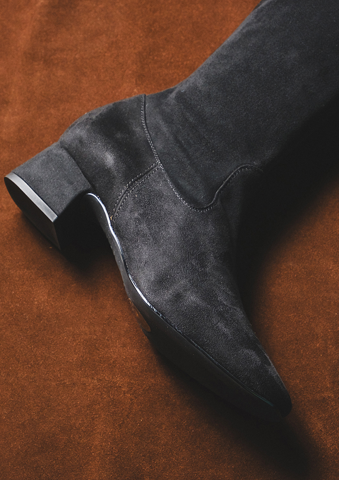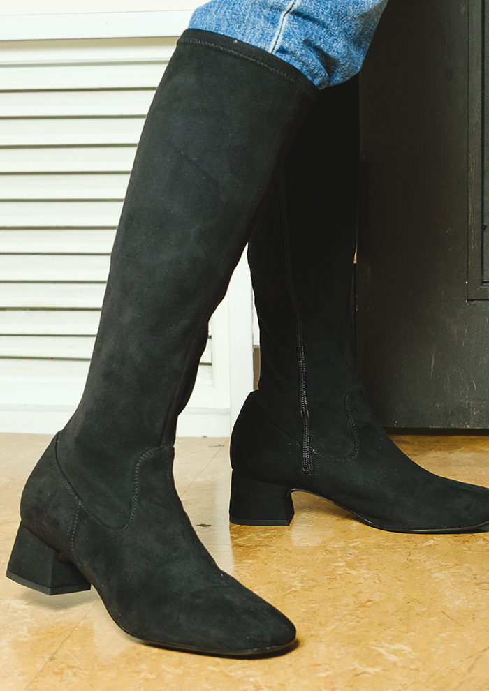 「足に沿うようなスマートなシルエットと、膝下まで続く美ラインが魅力のロングブーツ。伸縮性のあるスエード調素材は肌あたりが良く、内側ジップで着脱もスムーズです。ほどよい高さの4.5cmヒールが、スタイルアップと歩きやすさを両立。タイトスカートやワンピースに合わせれば、都会的な装いが完成します。スキニーパンツとのレイヤードにも難なくフィットし、冬のコーデを品よくアップデート。すっきり履けて、長く活躍するロングブーツです」。