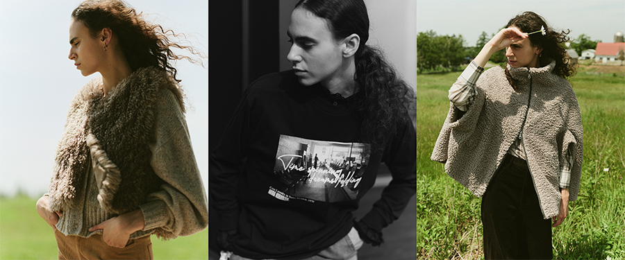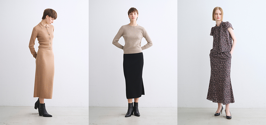 「ボアアウターやニットなど、素材感が際立つものには、タイトシルエットや別素材のボトムが相性◎。色・素材・形ともに幅広いラインナップでスタイリングも自在に組めます」。