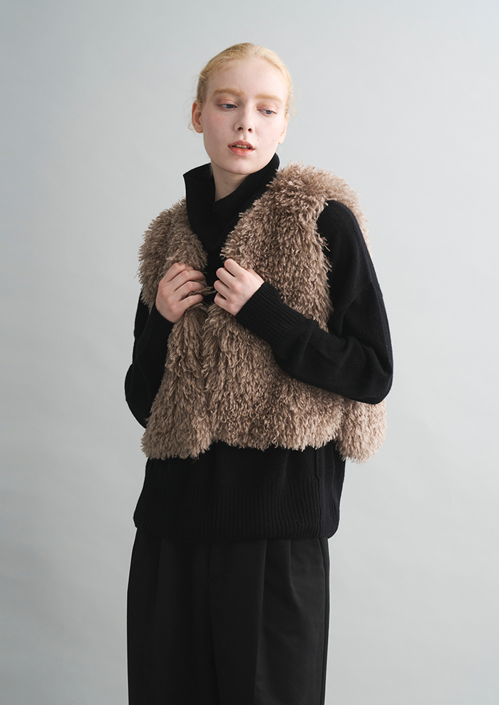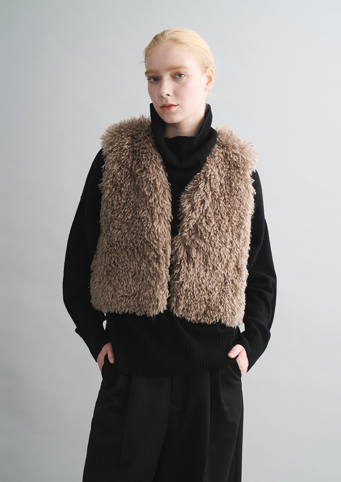 「入荷してはすぐに完売してしまう、ライトな着心地が魅力の“WAVY FUR”。着用感を感じないほどの軽さでありながら、スタイリングは確実にゴージャスに。汎用性の高いジレタイプと、今季は新型のハーフスリーブジャケットも登場しました」。
