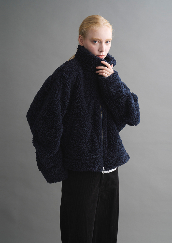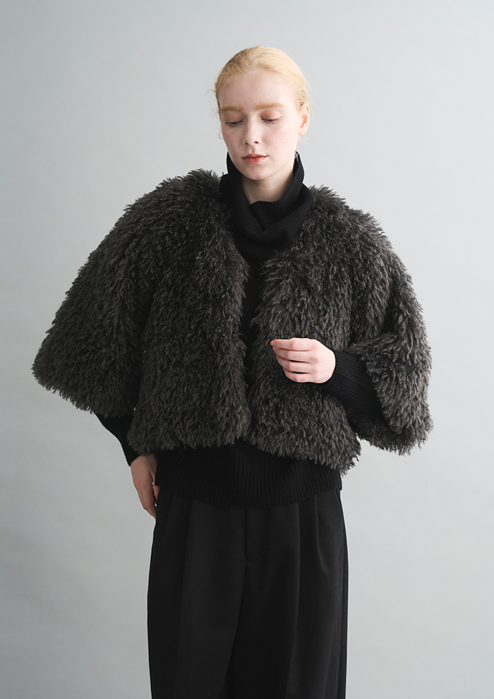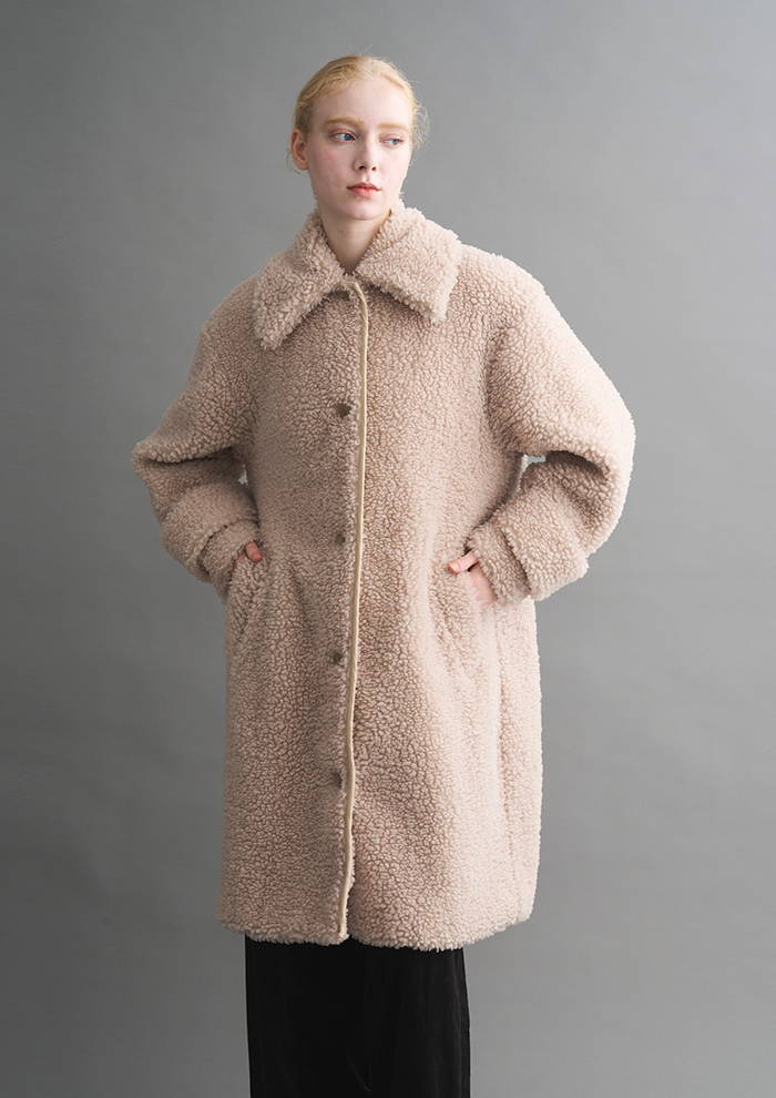 「「エコペル」社のリサイクルポリエステルファーを使用した“ECOPEL BOA”。毎年素材を変えながら、軽い着心地やボリューミーな見た目で人気を集めるシリーズです。今季はディテールが際立つようにボアを採用。ふっくら大粒で印象的なソフトボアが、「エコペル」ならではの特別感を醸します。こちらも“WAVY FUR”と同様に非常に軽く、肩のこらない着心地」。