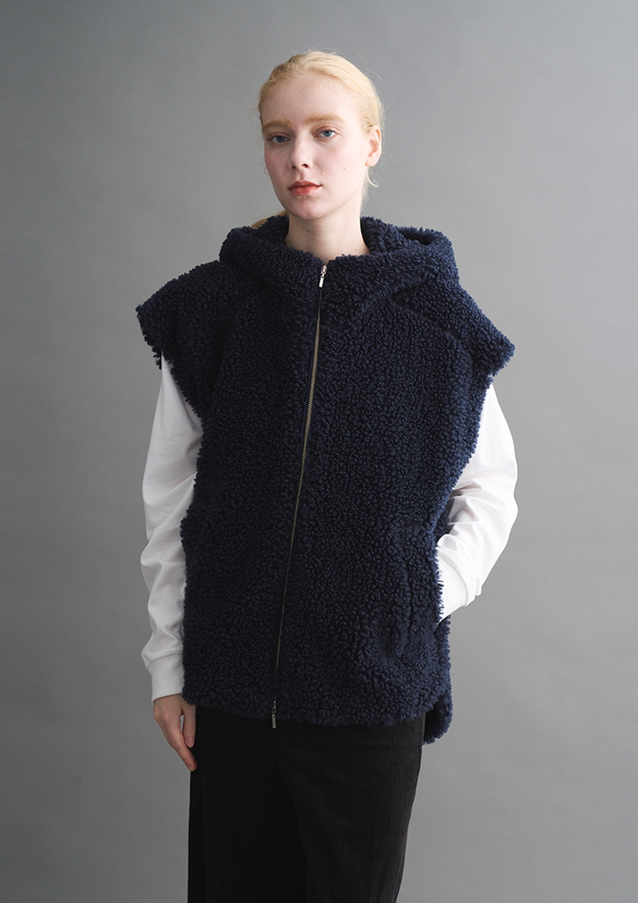 「ボリューミーなフードが顔まわりを包み込むベストは、サイドがスナップで開け閉めできるのが特徴。ドルマン袖のニットなら上のスナップを開けて、抜け感を出すなら下のスナップを開けてスリットを深くして楽しんで」。