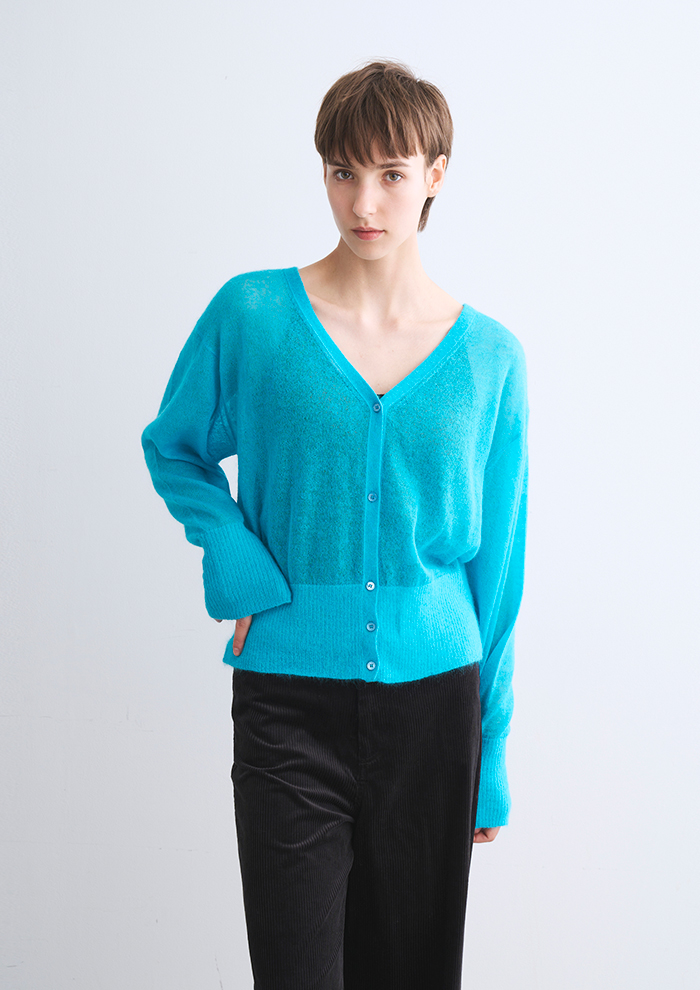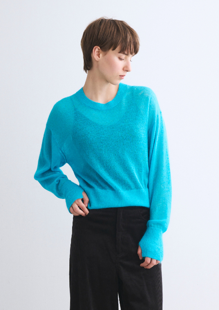 「思い切ったきれい色もスタイリングのマンネリ化を防ぐ必須アイテム。特にコートインに色を効かせると、顔まわりの印象がぐっと引き上がります。薄手のモヘヤなら暖房の効いた室内でも快適。ややシアー感もあるため、グラフィックT合わせもおすすめ」。