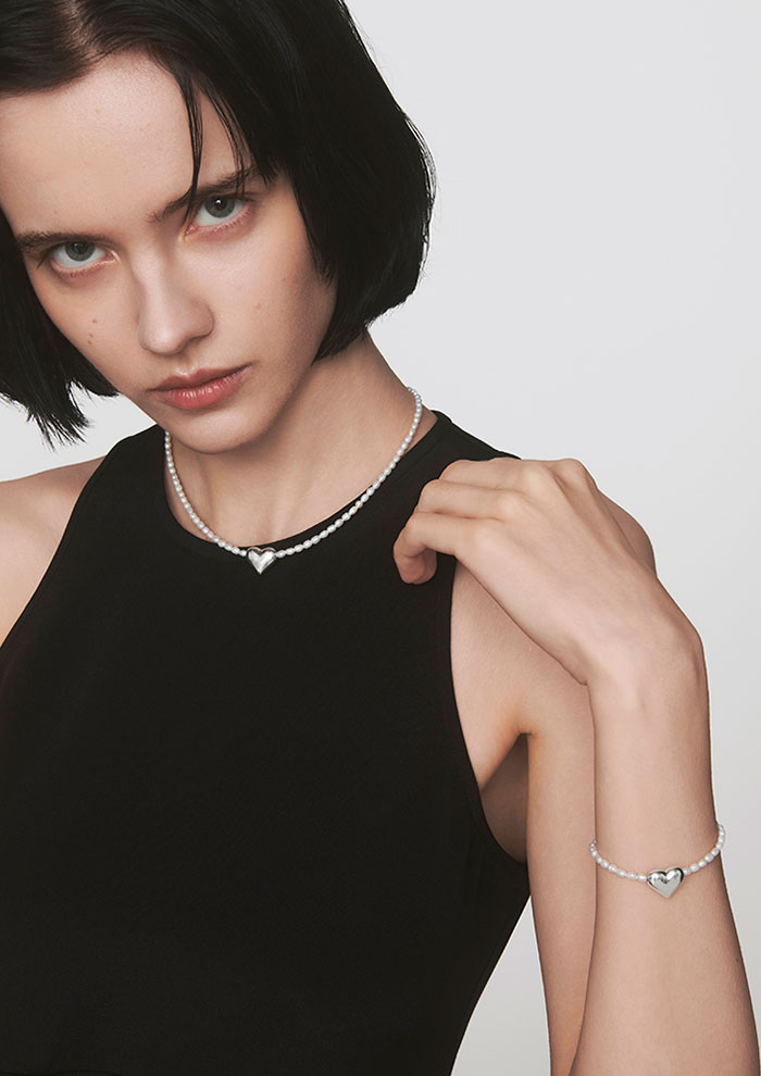 「手元もおそろいのブレスレットで合わせれば、アクセントとして圧倒的な存在感を発揮。愛と自信を象徴する堂々としたハートは、シルバーのシャープなツヤ感でクールかつ洗練された印象に。ジャケットやカットソーなどのシンプルな装いに◎」。