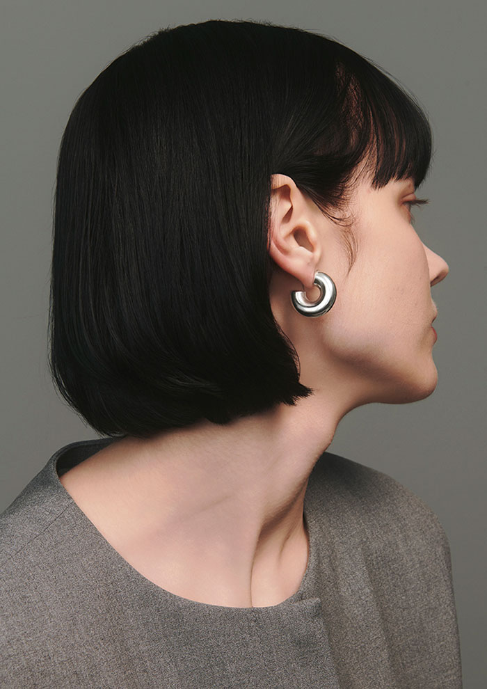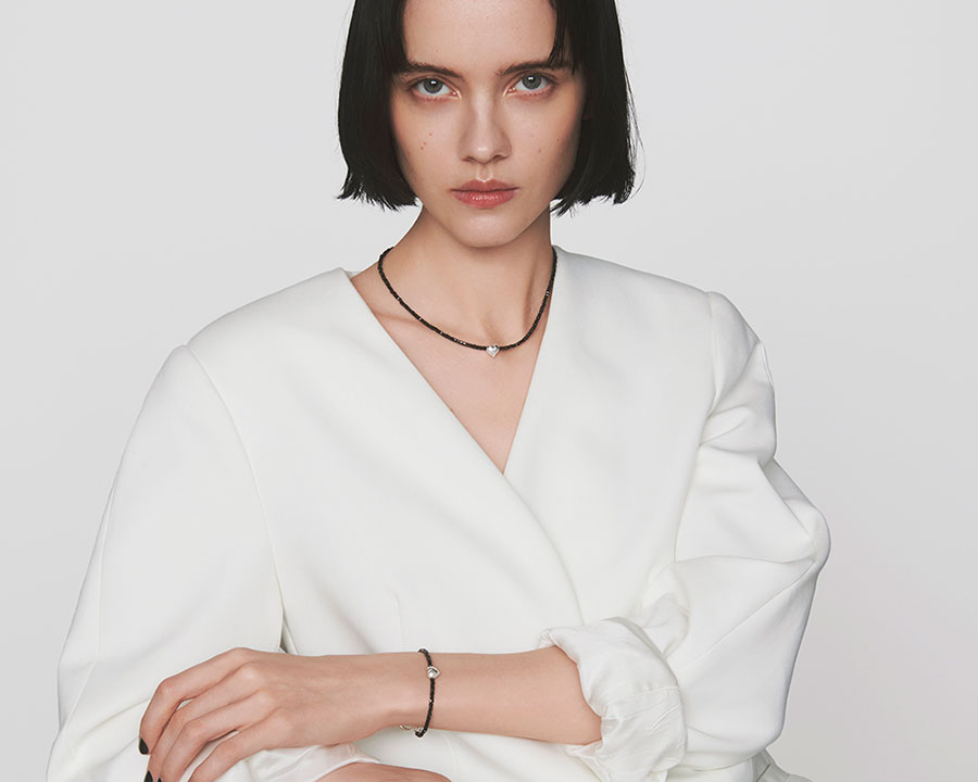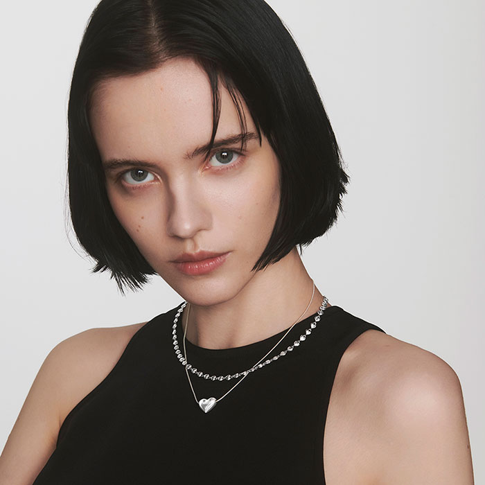 「潔いシルバーの輝きは、心の奥にある確かな輪郭を映し出す。ハートモチーフやグラフィカルなチェーンが、身につける人の知性とユニークな一面を引き出します。無駄なものを足さない強さ、何にも隠れない潔さ。クリーンで無垢なシルバーによって自分を解き放つホリデーシーズンを」。