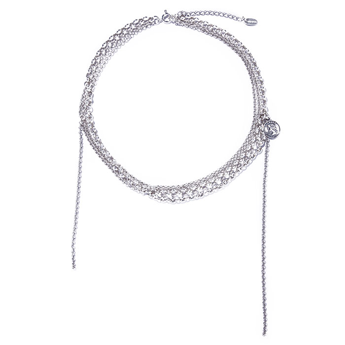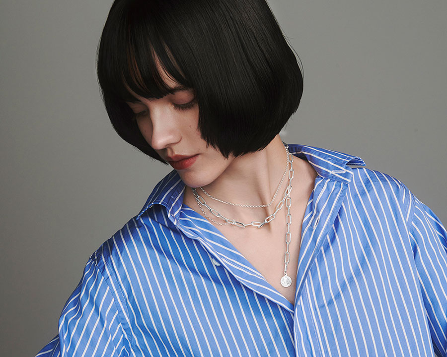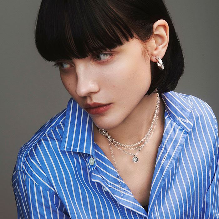 「こちらは、長さや表情の異なるチェーンを重ね合わせ、流れるようなリズムを描いたレイヤードネックレス。シルバー925の光沢をまとったサイドにさりげなく配したコインモチーフと揺れるロングチェーンが、モダンな縦ラインを実現。洗練のなかに忍ばせた遊び心を楽しんで」。
