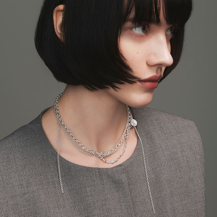 「異なる表情を持つチェーンが重なり合い、ひとつのリズムを奏でるように仕上げたネックレス。レイヤードの奥行きがモダンなムードを漂わせ、気分に合わせて角度を変えることで新しい魅力が感じられます」。