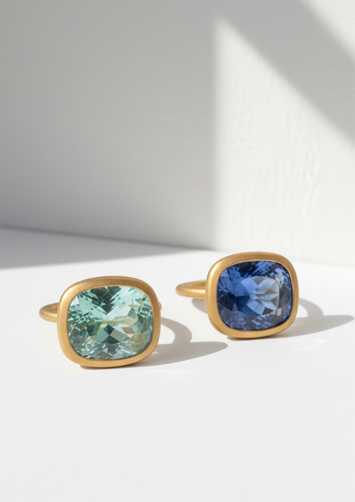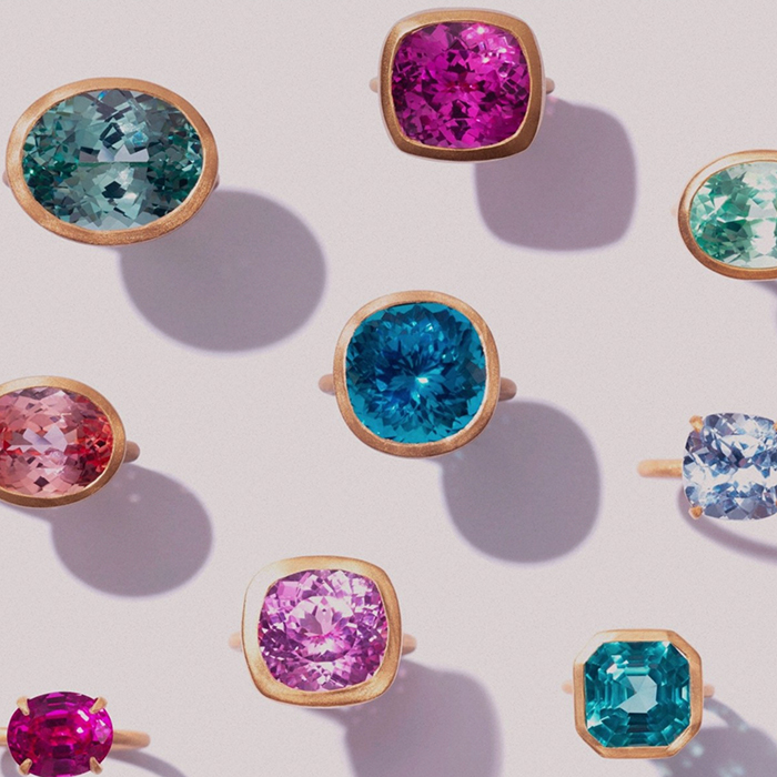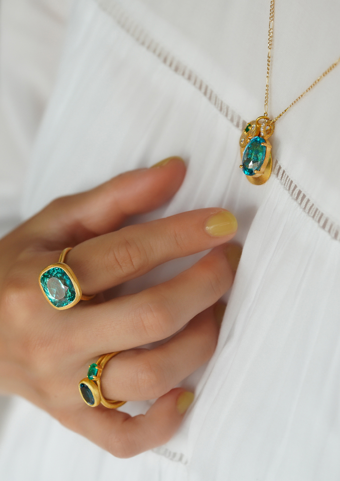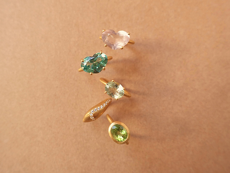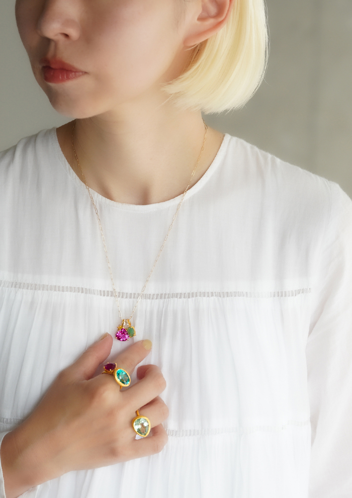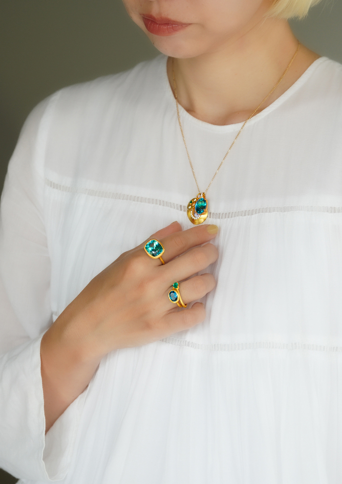「近年進化した加工処理技術により、石の持つ色味を引き出し、同時に透明度も上げる処理をしたサファイアを取り扱っています。限りある資源の活用が叫ばれるなか、以前はジュエリーとして使うことができなかった品質の原石が、技術革新により生まれ変わり、美しい光をまとうように。その経緯にも着目し、新しくポジティブなジュエリーとして展開しています」。