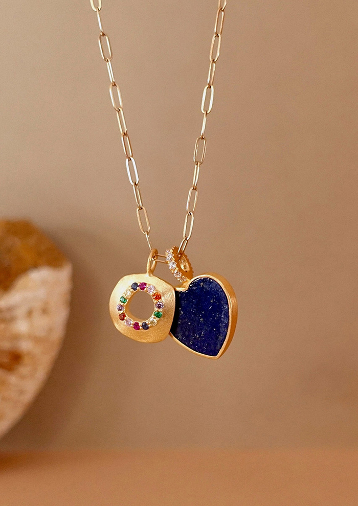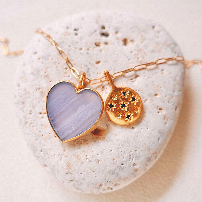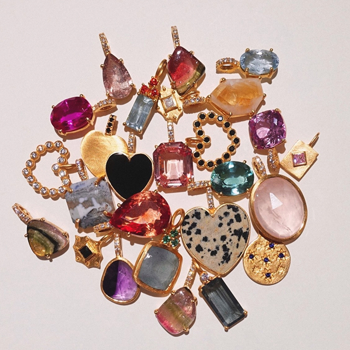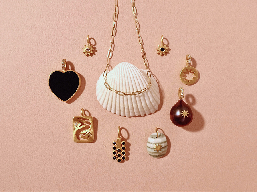 「こちらは、その日のファッションやお出かけ先によって毎日チャームを変えて遊べるシリーズ。天然石のみではなくメタルチャームを取り入れることで、コーディネートの幅がぐんと上がります。大きいチャームの横に小さいチャームを添えるなど、大小のコントラストをつければ4〜5個つけてもトゥーマッチになりません。指にのせるとバランスが取りにくいような大きな石も、チャームなら気軽に取り入れやすいはず」。