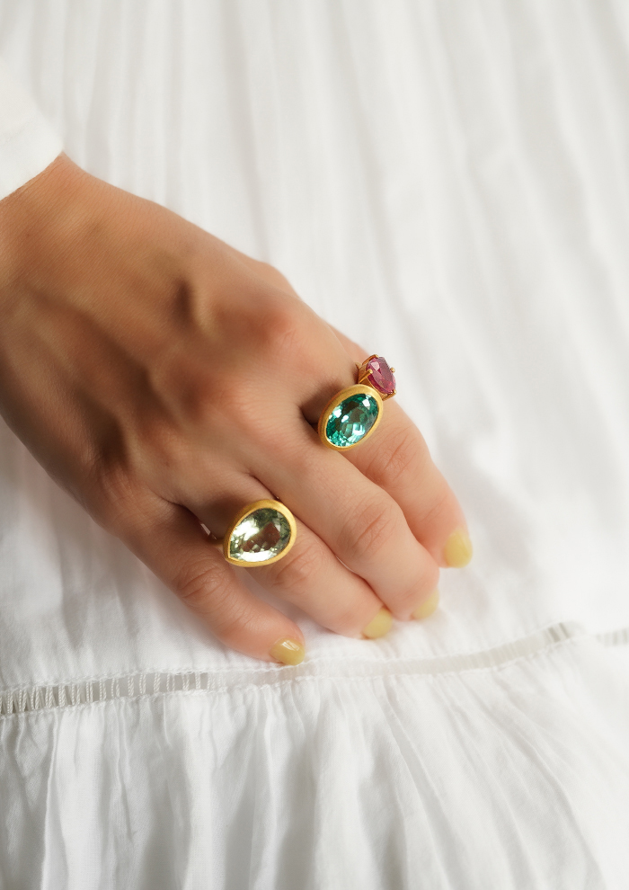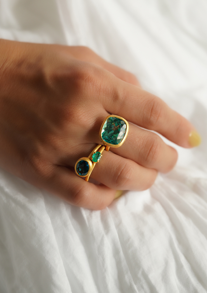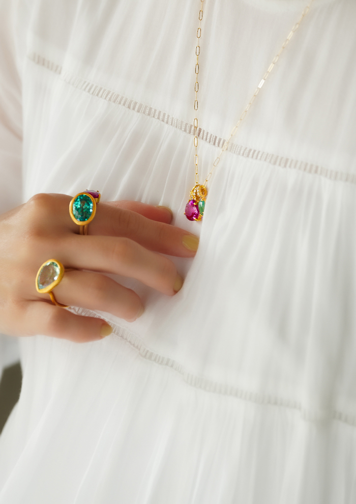 「鮮やかなレッドとグリーンのストーンが放つ、エネルギッシュな輝き。「クイ」のジュエリーは、色彩の組み合わせによって“感情”をまとうアートピースのような存在です。人差し指に輝くのは、サファイアと鮮烈なルビー。複数のカラーを重ねても不思議と調和するのは、「クイ」の石選びとセッティングの絶妙なバランス。色をまとうことで気分を変え、自分らしさを表現する——そんな思いに寄り添います」。