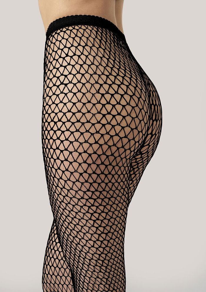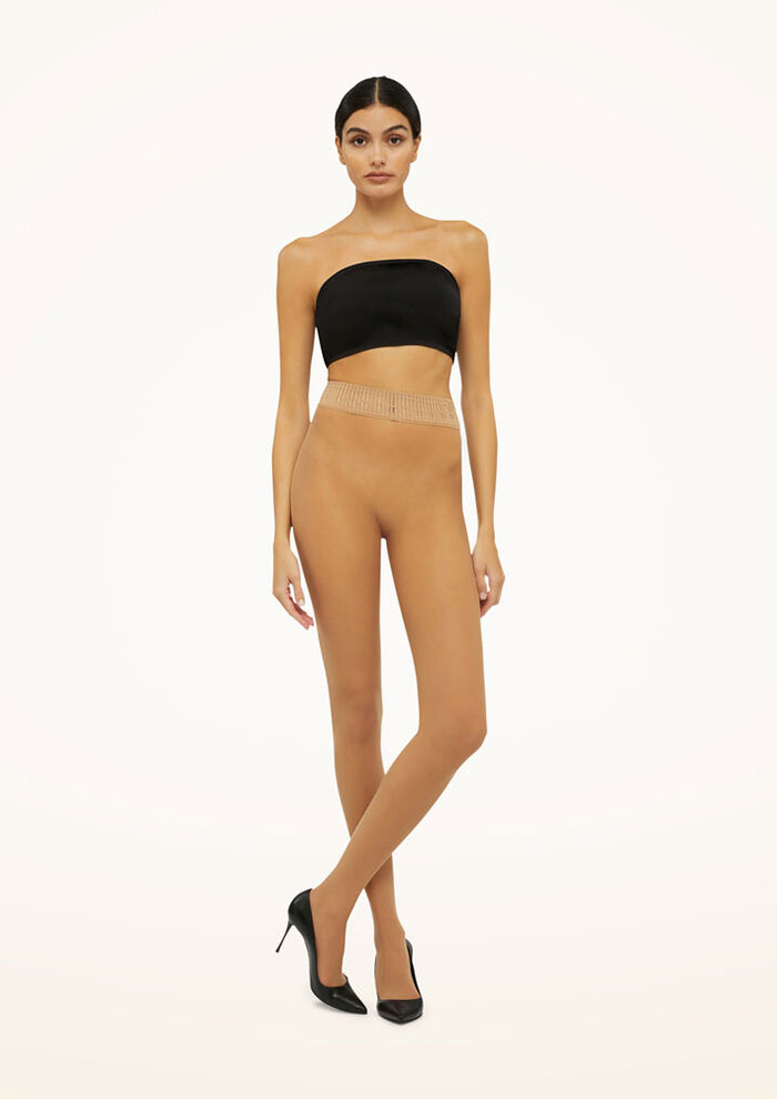 「足元をクールに印象づける“NET TIGHTS”は、複雑なグリッドパターンとタテ編みのシームレス構造で「ウォルフォード」の創造性と卓越した技術力を体現しています。さりげなくも個性的なウエストバンドのロゴディテールもアクセント」。