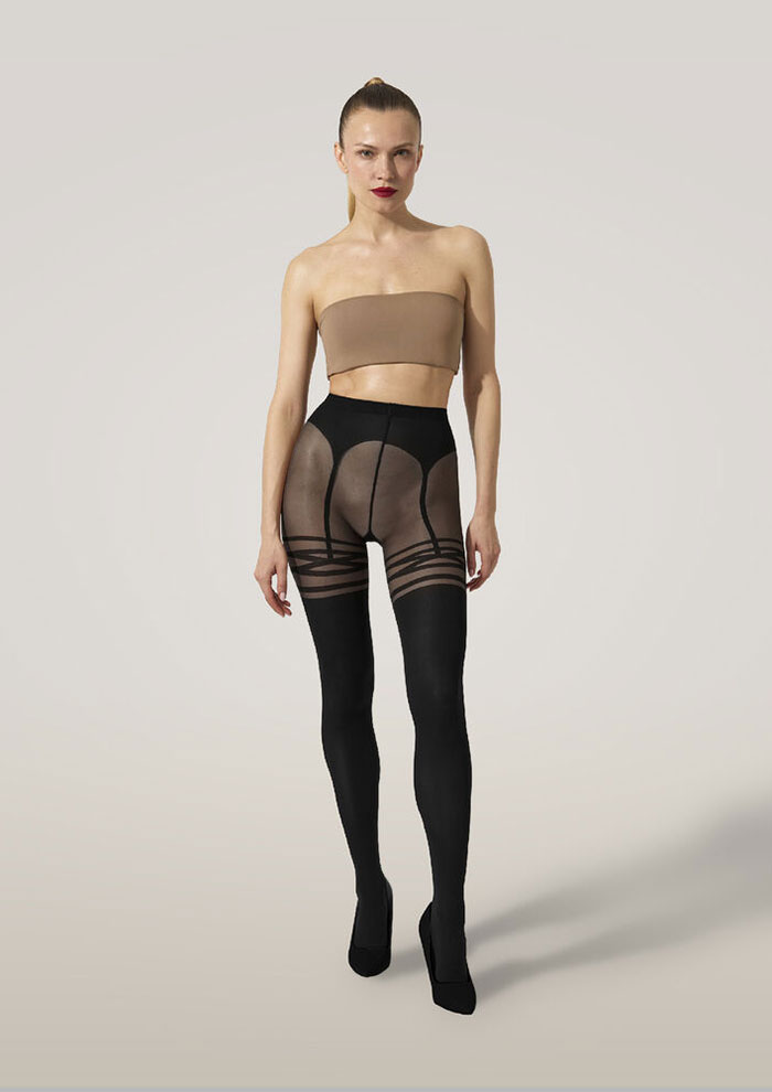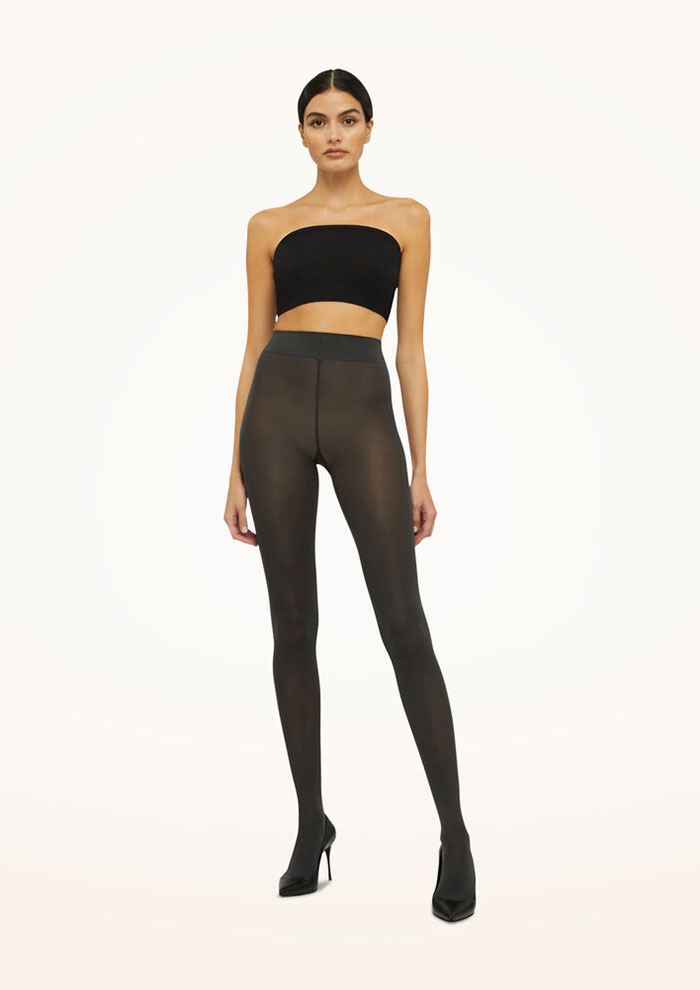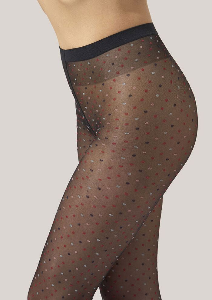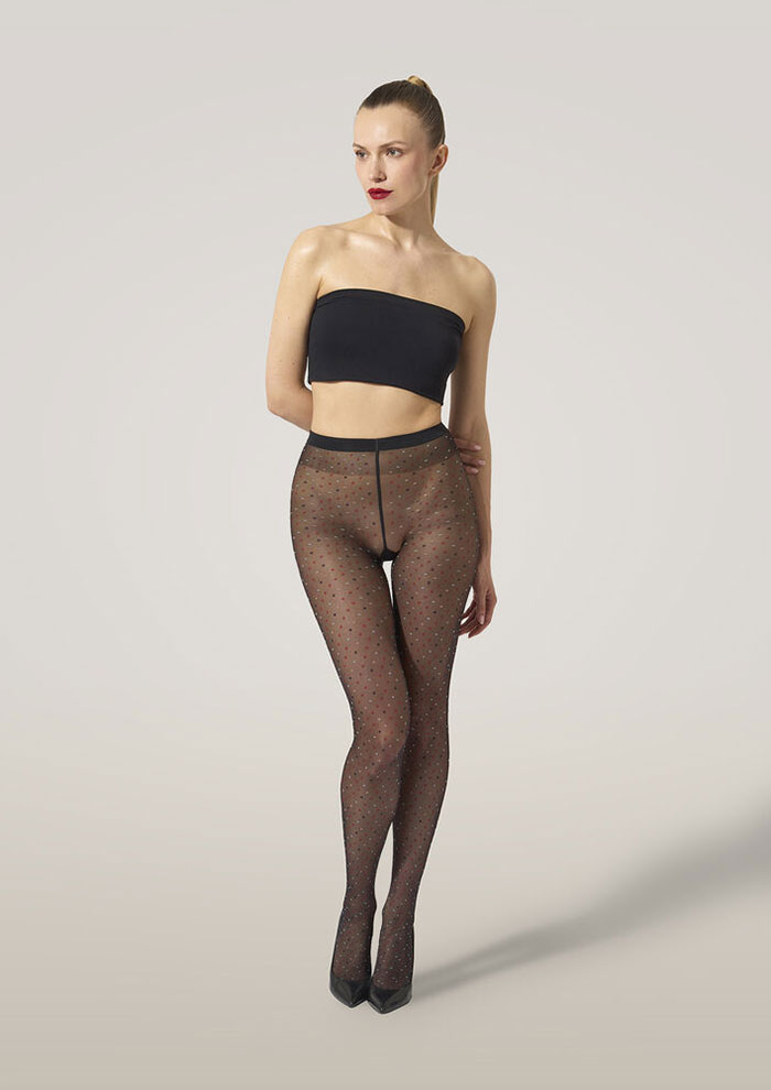 「遊び心あふれるマイクロドットタイツもお見逃しなく。いつものスタイリングにプラスするだけで、シアー&オペークの質感が個性と彩りを添えてくれます。シックなスタイルがお好みの方は、マットブラックをチョイスして」。