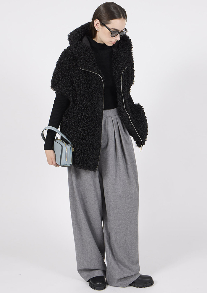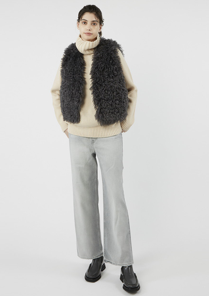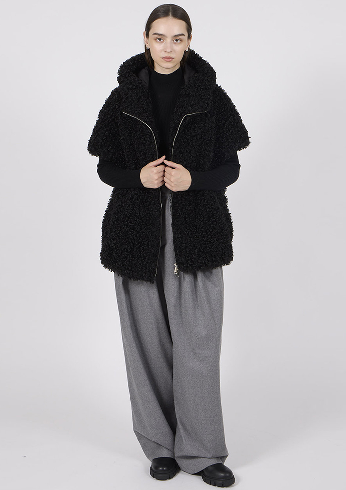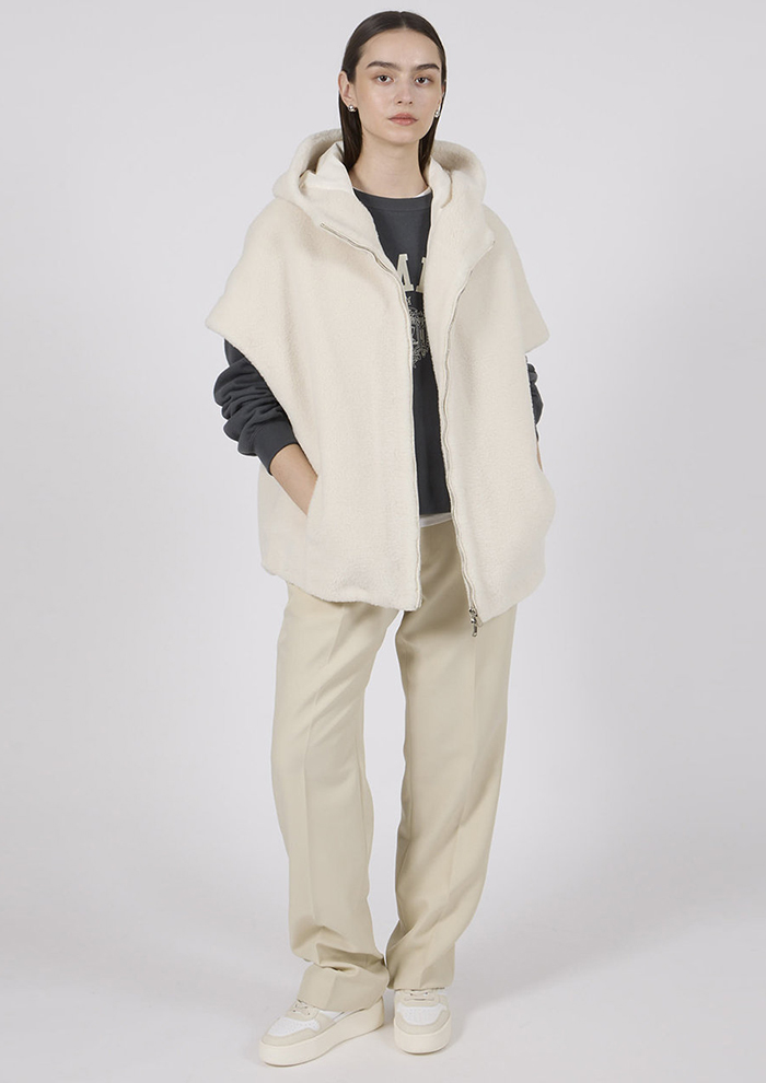 「高級感のある「エコペル」社のラム風ファブリックを用いた、シーズンムードとトレンド感を兼ね備えたジレも要チェック。肩まで覆うフレンチスリーブデザインによって、華奢見えを実現します。ゆったりとしたシルエットにヒップまで隠れる着丈は使い勝手が良く、着まわし力もお墨付き。ニットやシャツなど、いろいろなトップスとのレイヤードを楽しんで」。