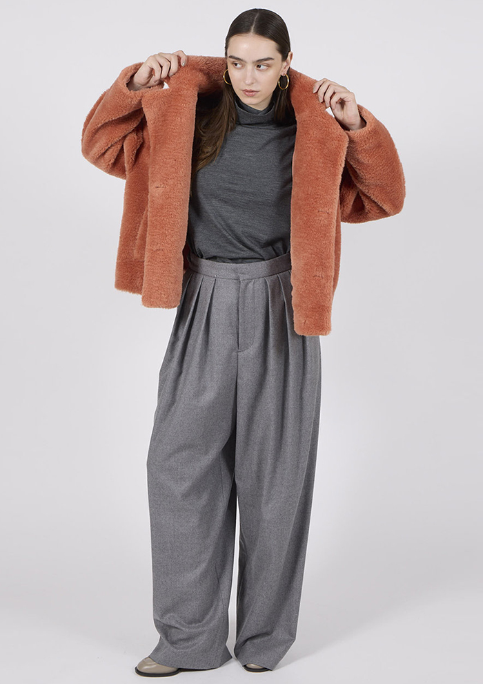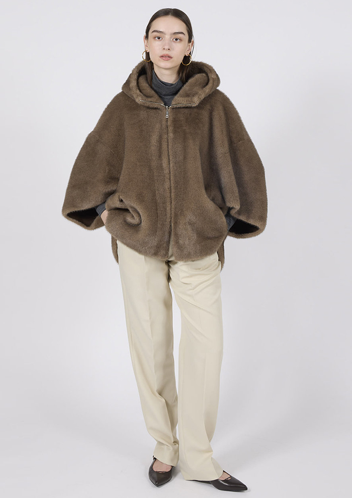 「リアルファーのような毛並みのミンク風フェイクファーが装いを上品に導くジャケット。柔らかくほどよいツヤ感があり、リュクスな雰囲気と軽やかで洗練された印象をまとえます。その魅力を生かし、余分な重さを排除した一枚仕立てで製作。さっと羽織るだけで、ラグジュアリー×ミニマルな着こなしを叶えます」。