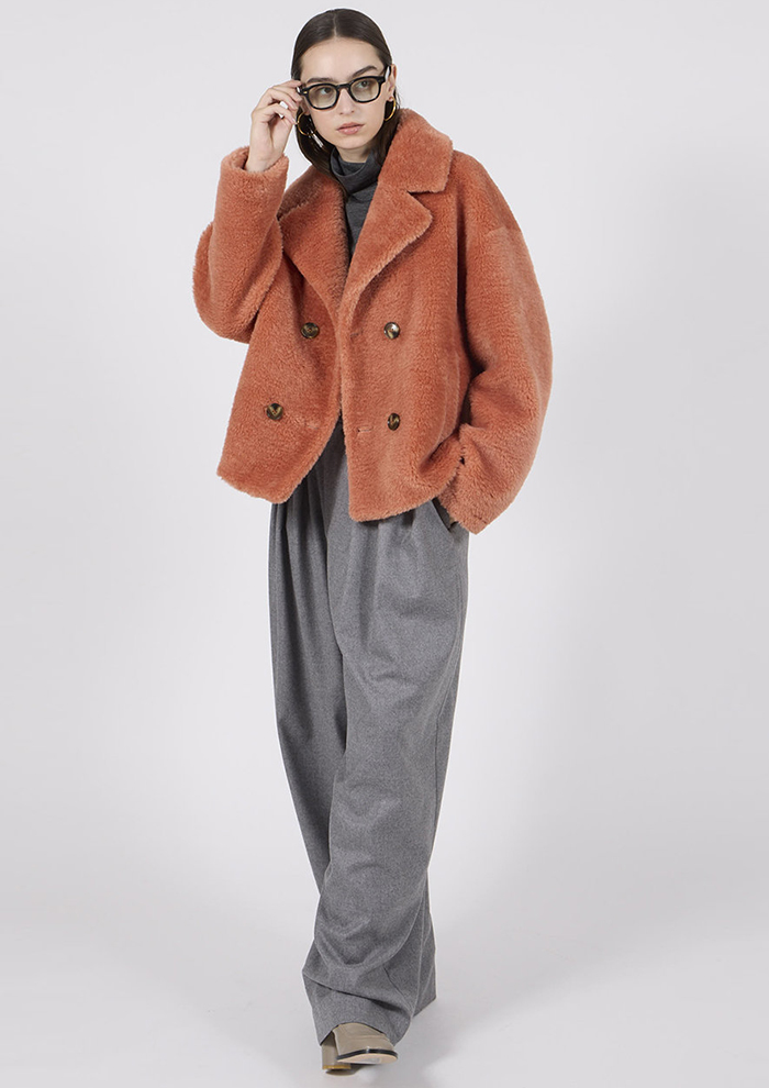 「毛並みが美しいレッキス風フェイク素材のテーラードジャケットは、リッチな雰囲気と季節感をぐんと高めてくれる一着。オーバーサイズ×ショート丈の旬シルエットが、トレンド感のある着こなしを完成させます。ワイドパンツやマキシ丈ワンピースとも相性◎」。