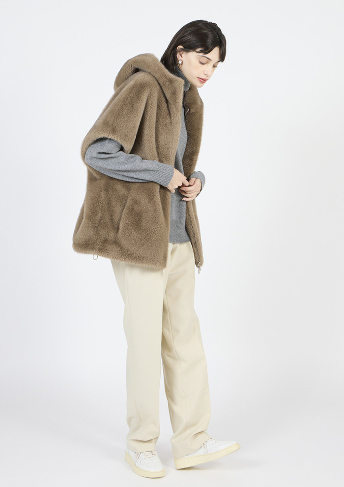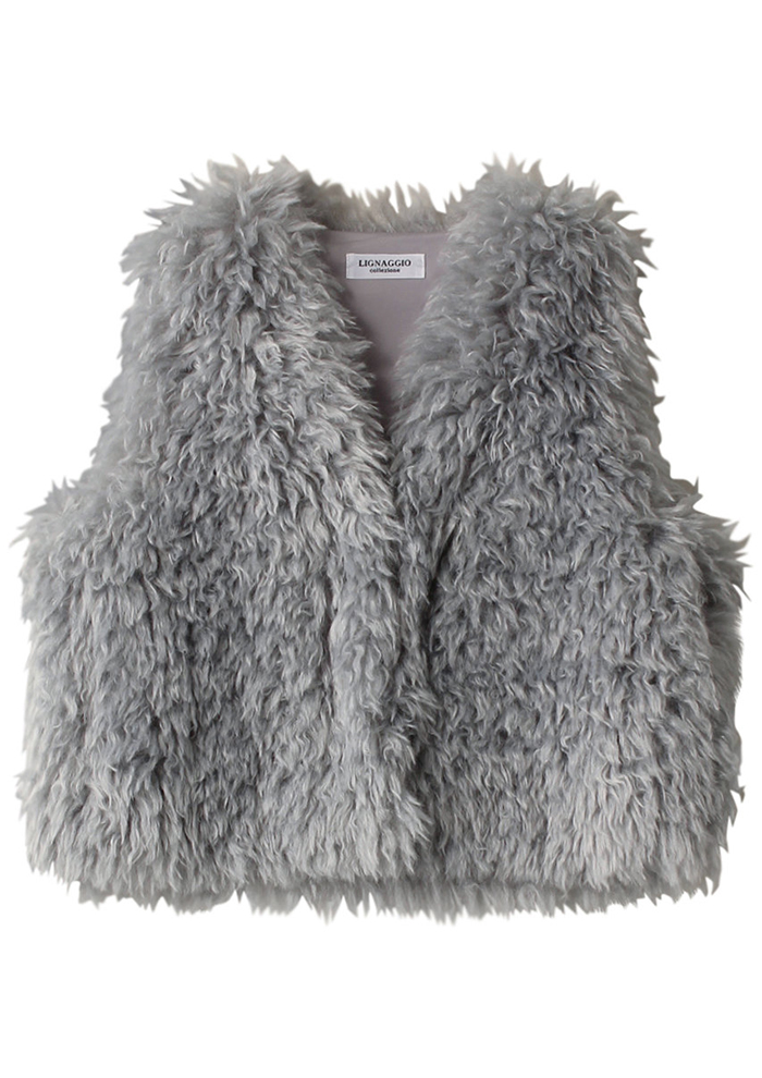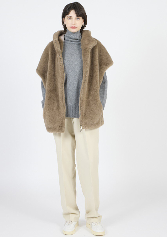 「さまざまなスタイルが楽しめる、秋冬シーズンの頼れるジレ。ミンク風のとろける肌触りが見た目にもリュクスな雰囲気を漂わせます。すっきりとしたIラインシルエットもシックで落ち着いた印象。フェイクファー部分は取り外しができ、シンプルなダウンベストとしても着用できます」。
