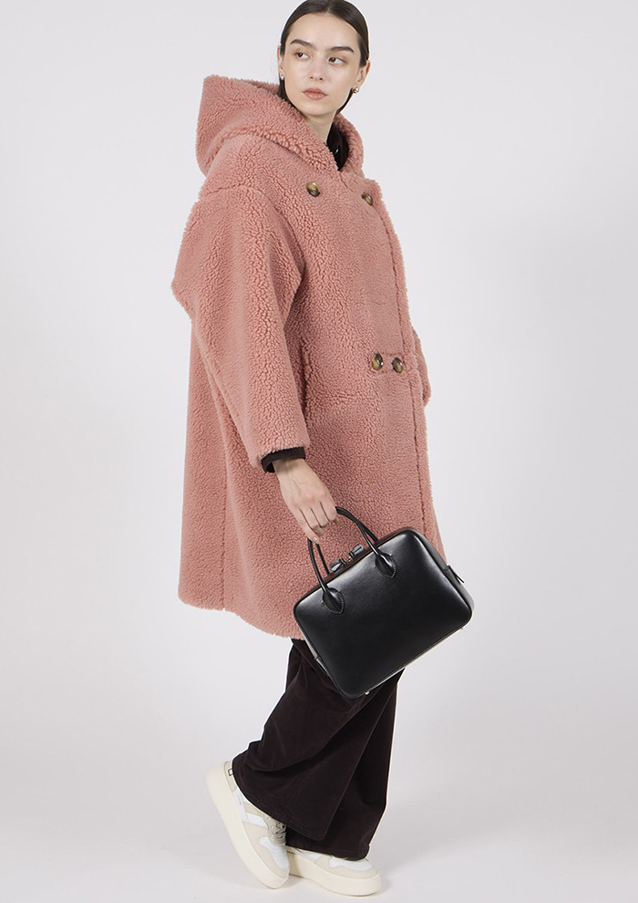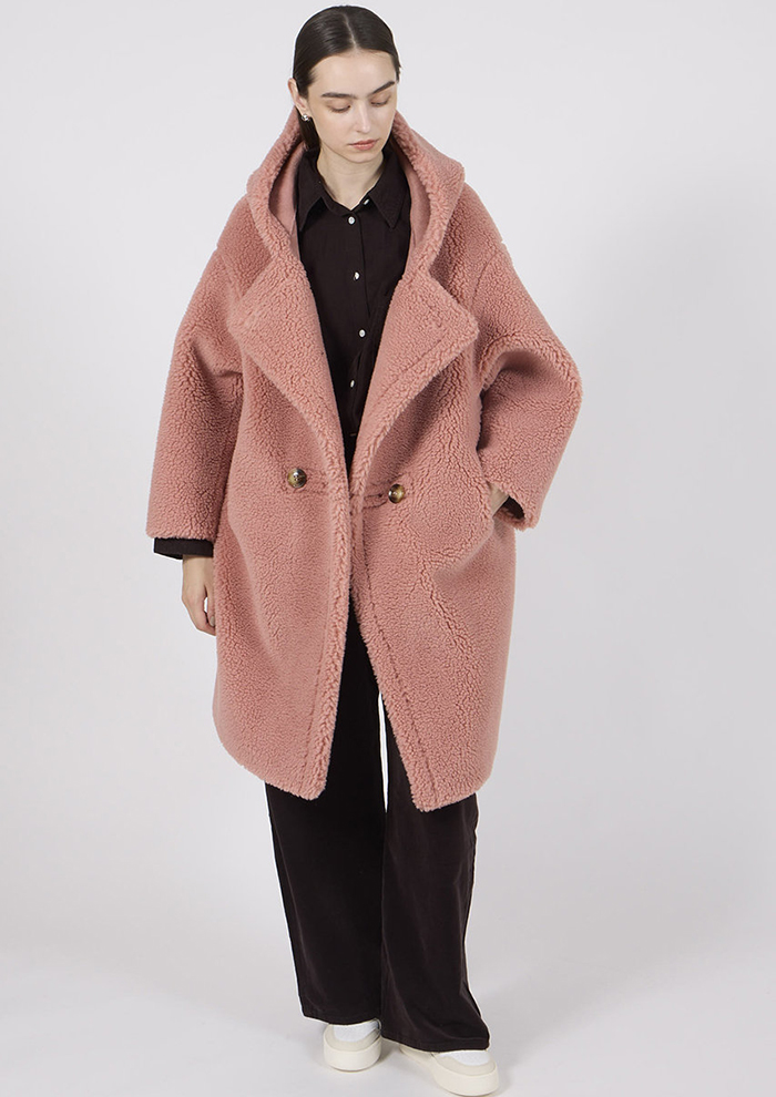 「暖かみのあるボア素材でシーズンムードたっぷりに仕上げたフーディコート。フードが付いたデザインは、モコモコの素材感とこなれたオーバーサイズが特徴です。今季はピンクとブルーが仲間入り」。