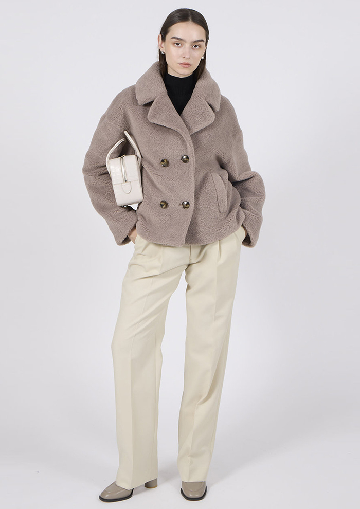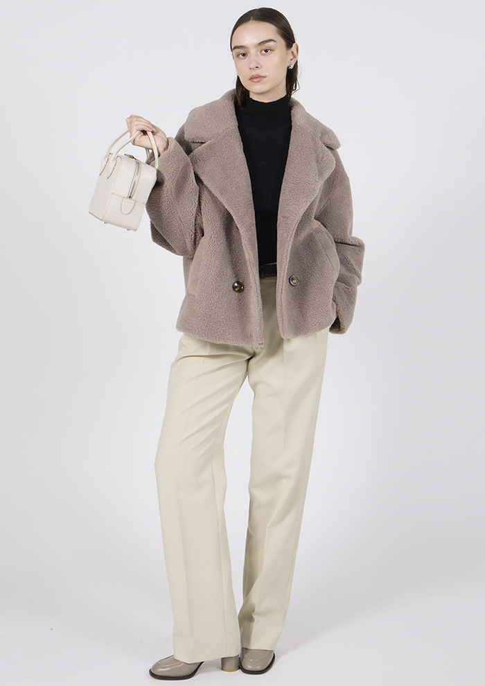 「こちらは、どんな装いにもさっと羽織るだけで華やかな印象にチェンジできるジャケット。子羊の毛を刈り取った後の短くカールした毛並みを模した、「エコペル」のラムシャーリング風素材です。リアルな風合いと軽やかさが、暖かな冬の装いをお約束」。