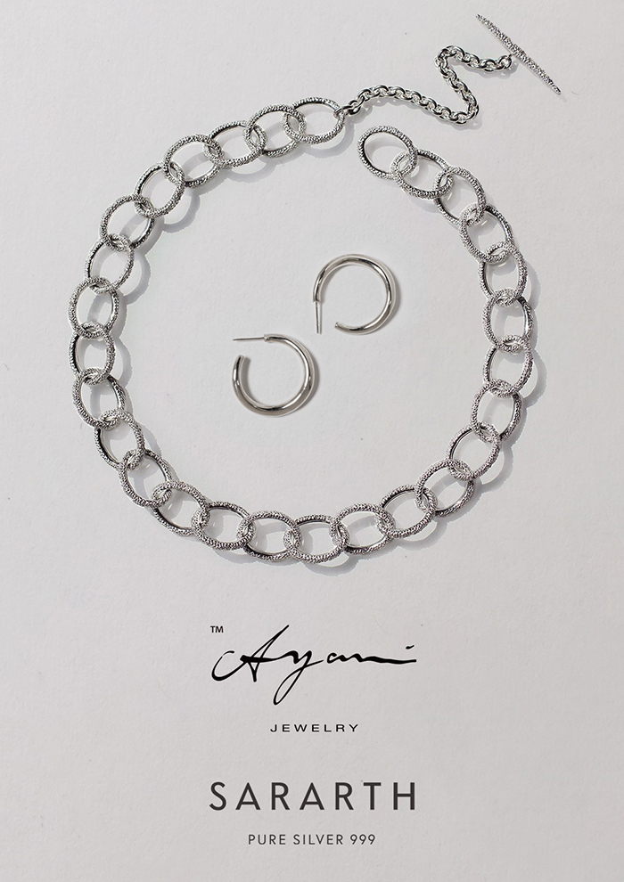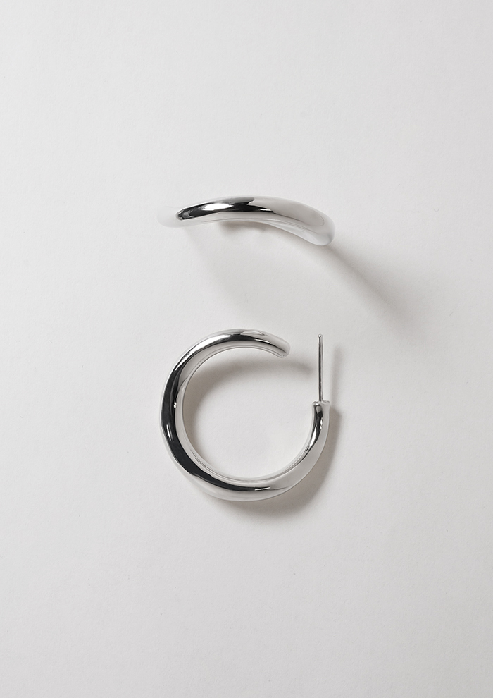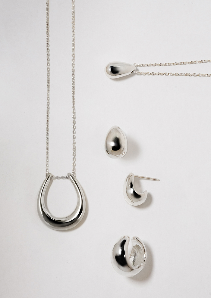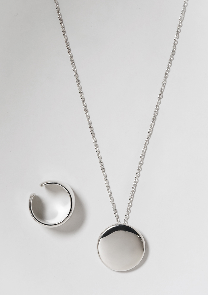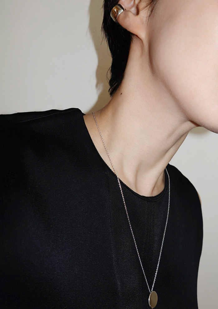 「プレートイヤーカフとコインペンダントの潔いフォルムが映す、光と影のコントラスト。それは、静かなラグジュアリーの象徴でもあります。シャープでありながら、肌に寄り添うやわらかさを宿したデザインが、どんなスタイルにも落ち着きのある佇まいをプラス。動くたびにそっと揺れ、ささやかな輝きを放つ…日常に、凛とした余白を添えてくれます」。