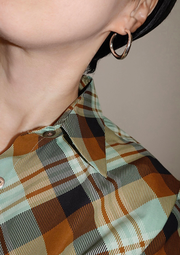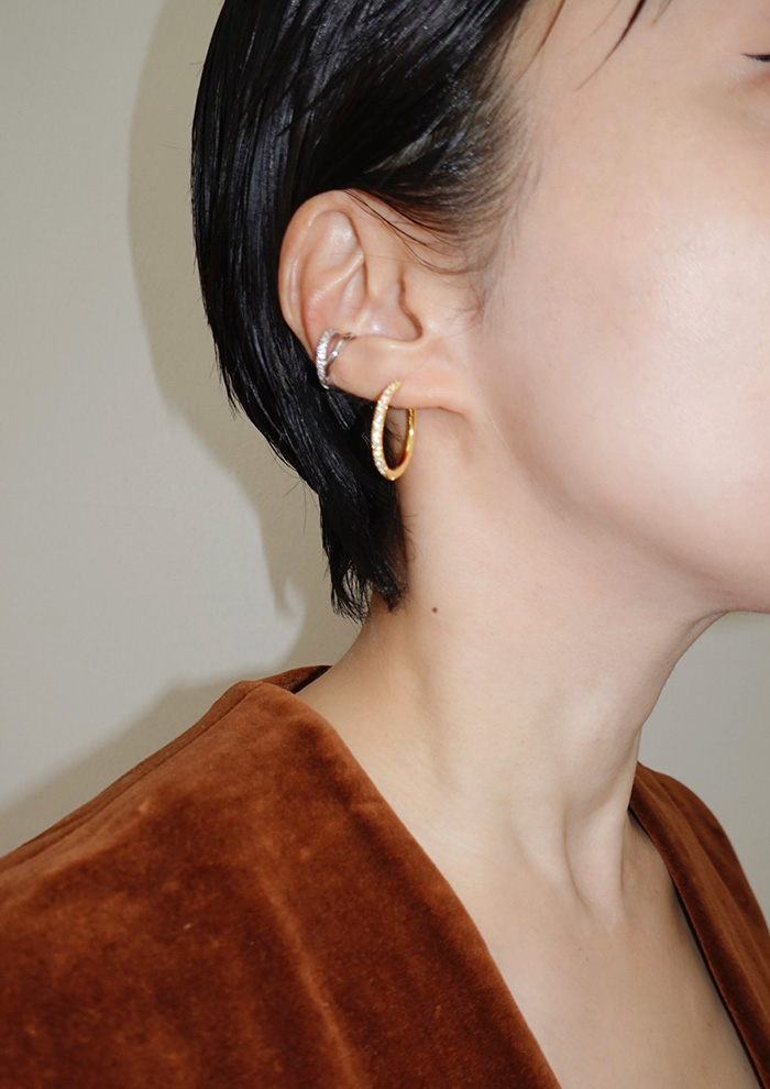 「ジュエリーをデザインするときも、日々の装いを選ぶときも、いつも大切にしているのは“心が上向くかどうか”。過剰ではなく、さりげなく。自分だけが感じる高揚と心地よさがそこにあるかを見つめています。ミニマルなフープピアスは、いつだってスタイルを整えてくれる存在。こだわった丸みと、流れるような艶やかなライン。顔まわりに凛とした光を宿し、そっと自信を添えてくれます。ヘアはタイトに、Vネックでシンプルに。控えめなサイズでも、上質な地金の質感が“静かな余裕”を語ります。日常にさりげなく寄り添い、心まで満たしてくれる存在に」。