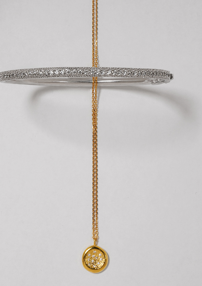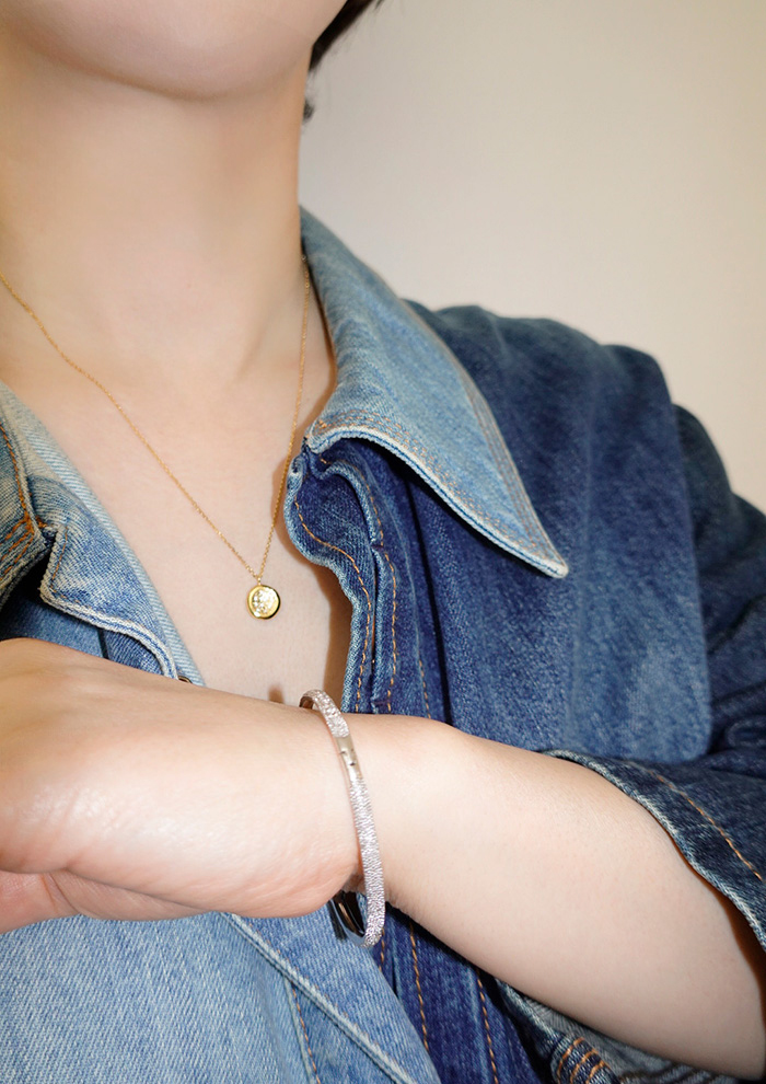 「手元に存在感を添える、静かに際立つバングル。重ねて楽しむのも良いけれど、この冬はひとつで上質をまといたい気分。袖口から覗くたび、上品にきらめきます。ネックレスは、メタルもパヴェも日常にすっとなじむサイズ。デニムやカジュアルなジャケットと合わせて、素材のコントラストまで楽しみたい。仕草のひとつひとつを美しく見せる、とぎすまされたミニマリズムです」。