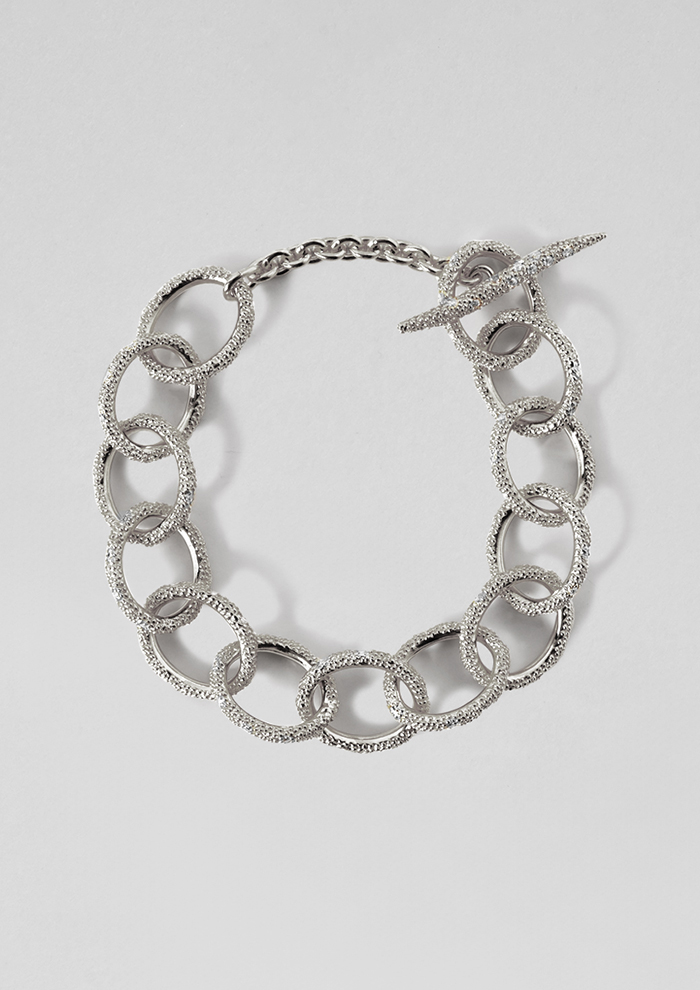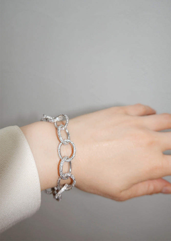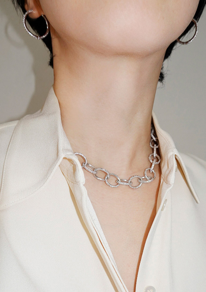 「存在感のあるチェーンネックレスでありながら、驚くほどすっとなじむ一品。ていねいに仕立てた丸みと、繊細な石留めが、シンプルにも個性的なスタイルにも自然に寄り添います。柔らかなニットやシルクシャツなどと合わせて、素材の温度感まで楽しんで。ひとつひとつのパーツの立体感が装いに奥行きを出し、トレンドにとどまらない、長く心を満たす高揚をもたらします」。