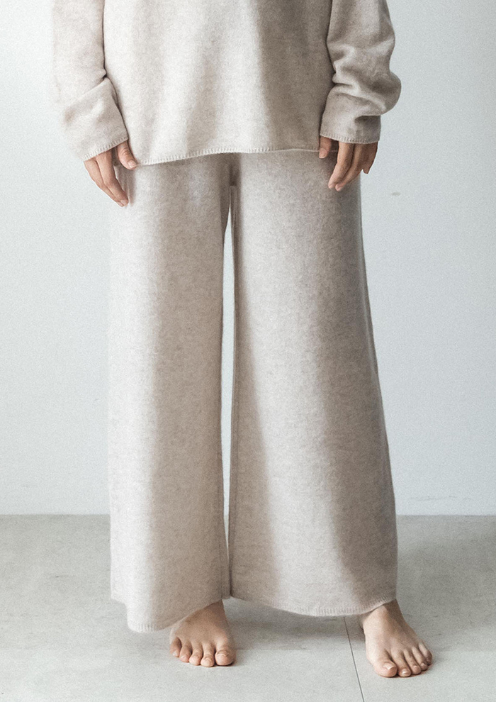 「まずは、細番手のオーガニックカシミヤを使って空気を含ませるように編んだハイネックから。抜群の着心地とゆったりとしたシルエットが、上品かつ軽やかな着こなしを叶えます。同じ技法で仕上げたワイドパンツとのセットアップもおすすめ」。