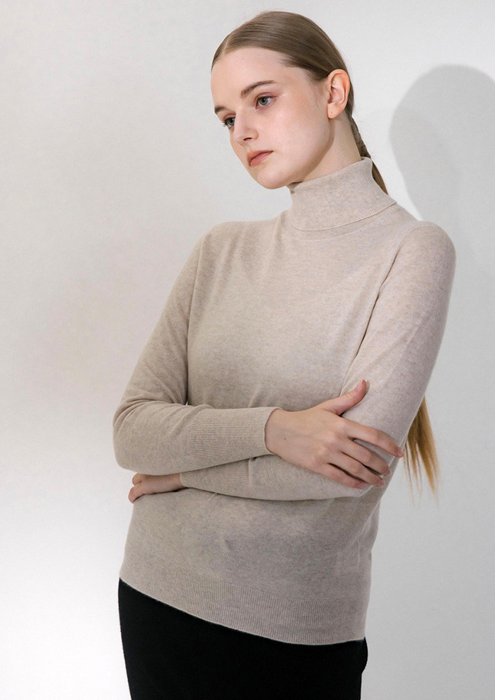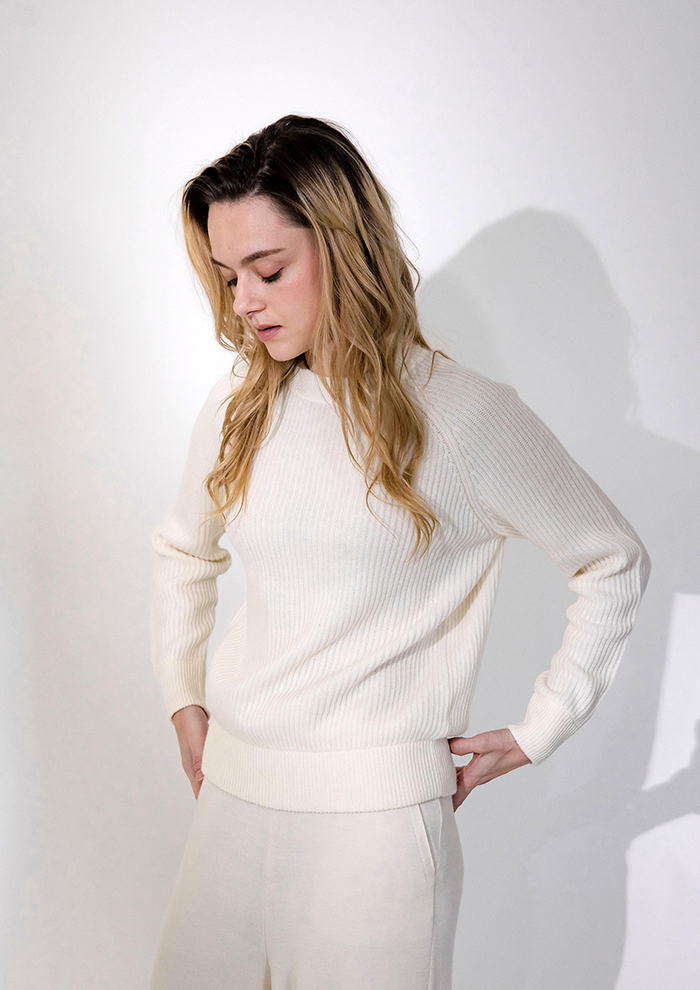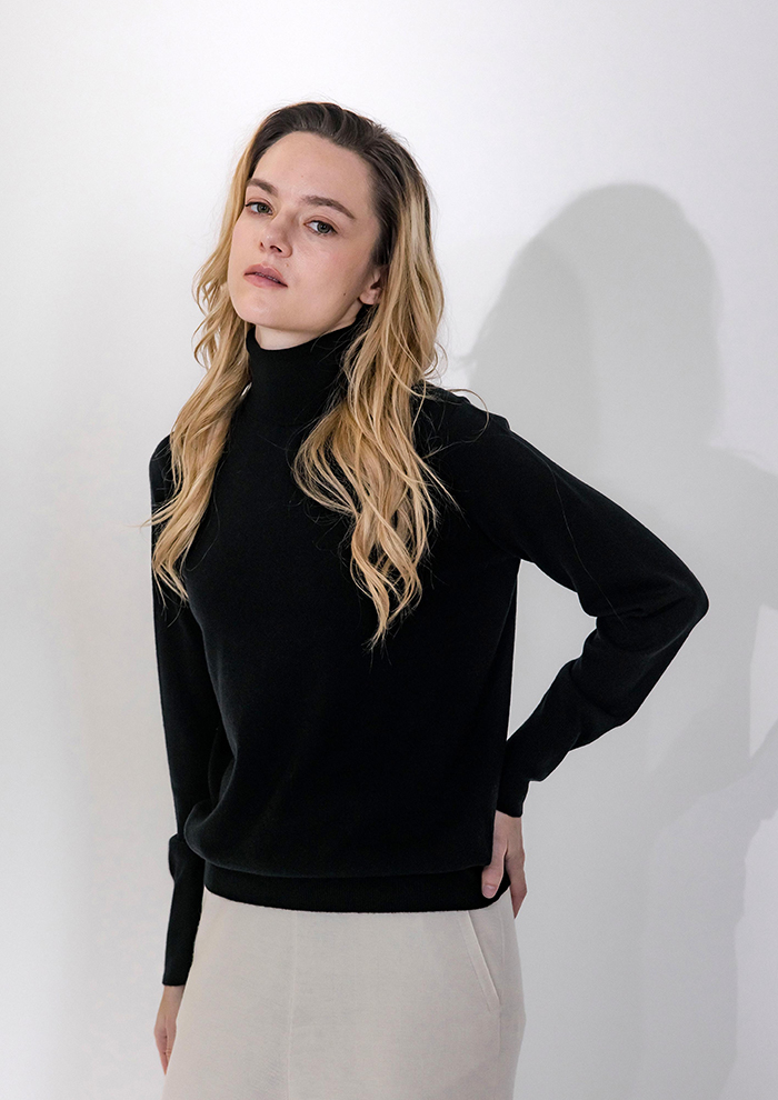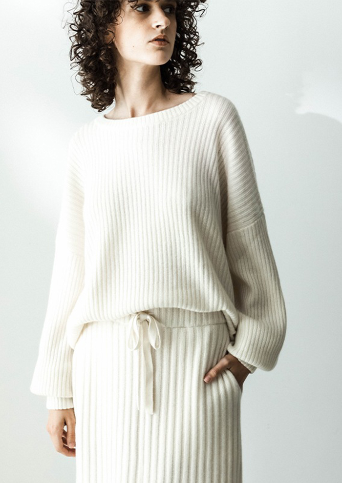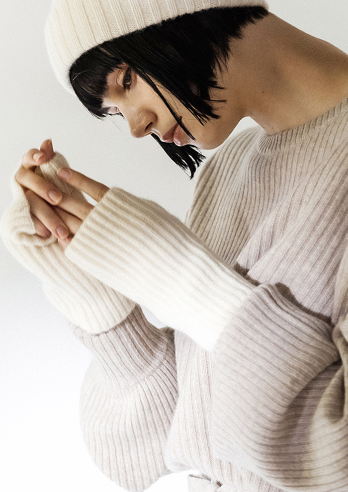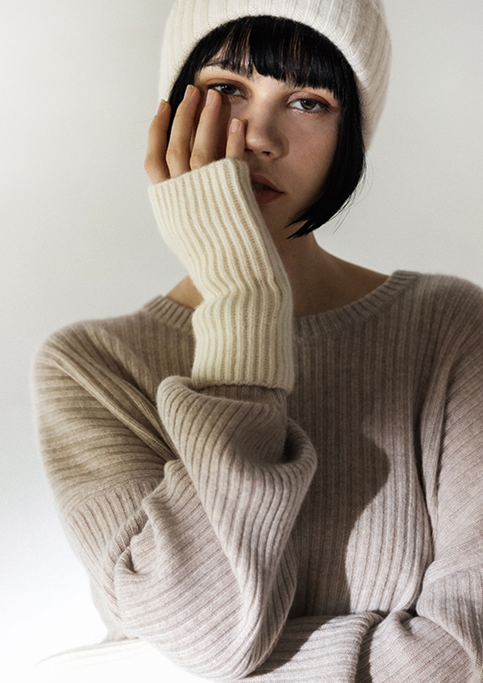 「均一に整ったリブ編みはシンプルだからこそ際立ち、縦のラインがつくる美しい表情が上質感を一層引き立てます。無駄を削ぎ落としたデザインがカシミヤ本来の魅力を余すことなく引き出し、どんなスタイルにも使える着まわし力を発揮。時代をこえて愛され続ける、洗練されたベーシックです」。
